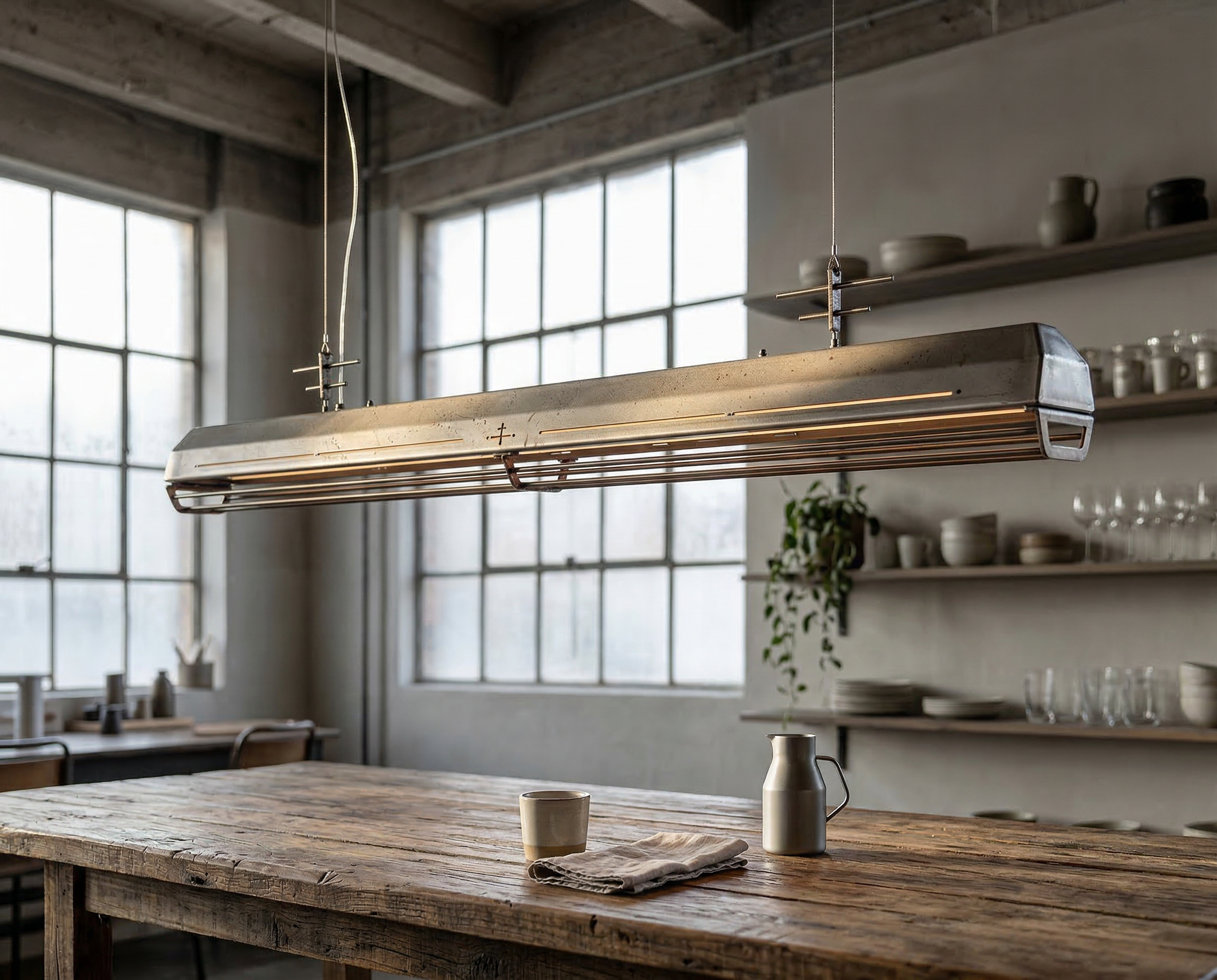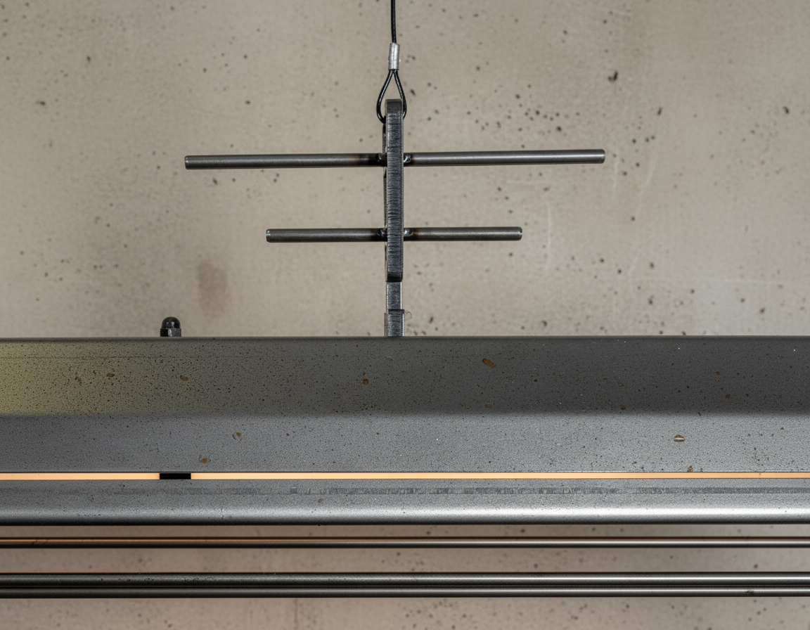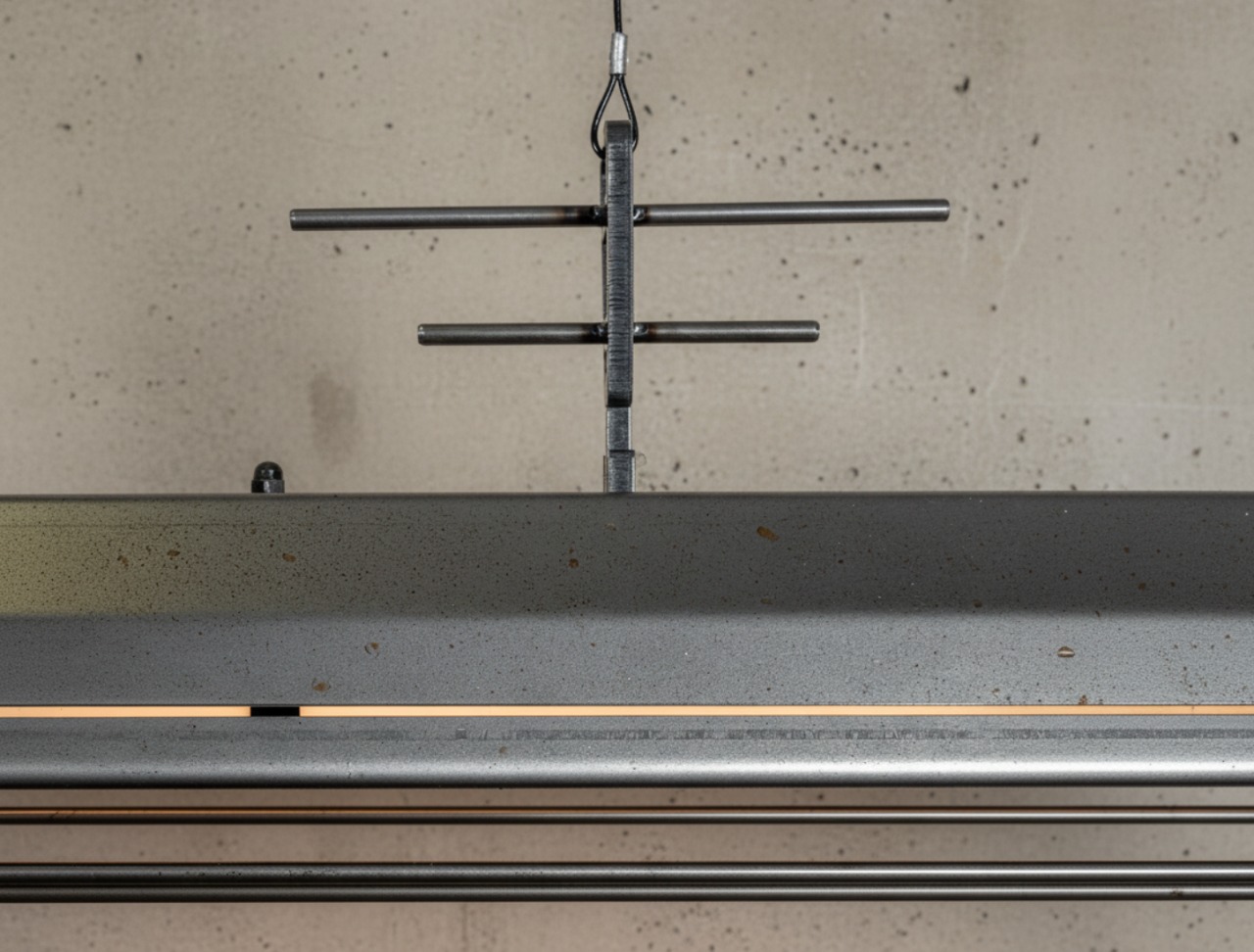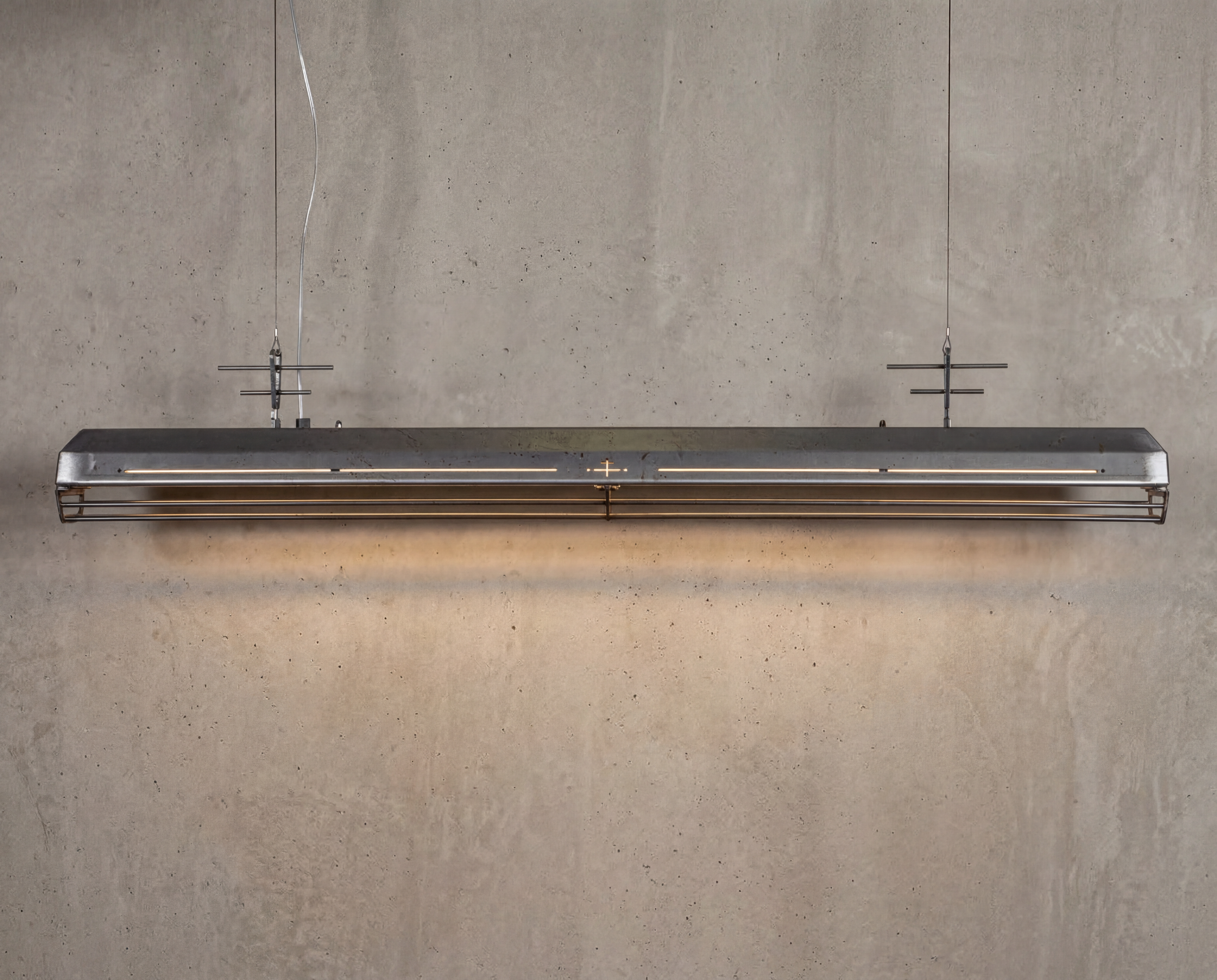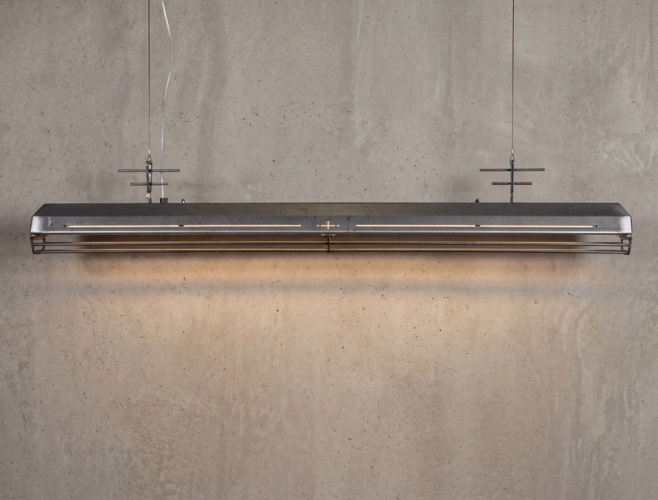 A long industrial presence, defined by its distinctive hangers and the protective grill that runs beneath. In Natural finish, the steel is left exposed—scratches, small flaws, and rust points kept visible, like the surface never forgot the workshop. Precise hardware, lived-in materiality: tactile, honest, and unique in every piece.