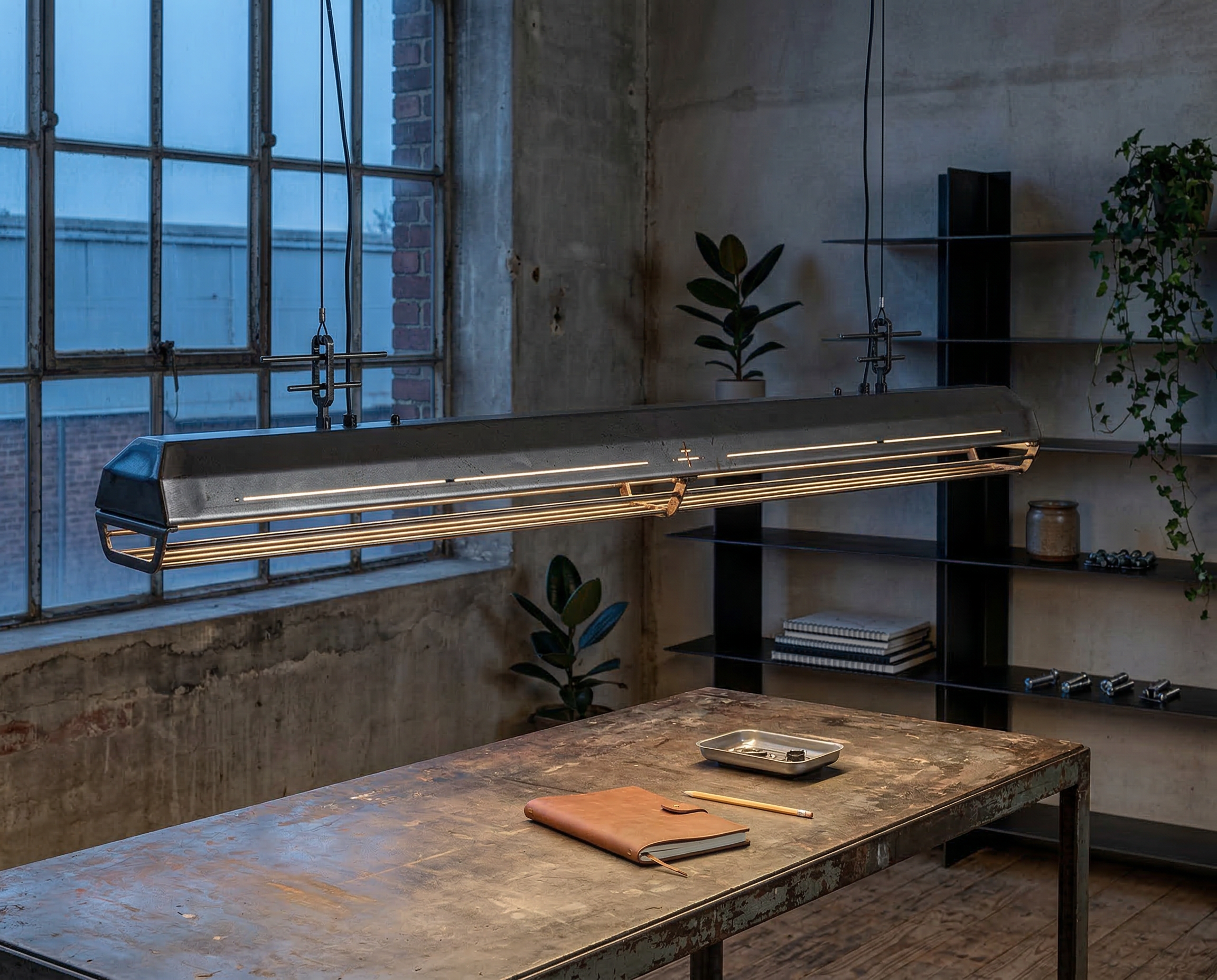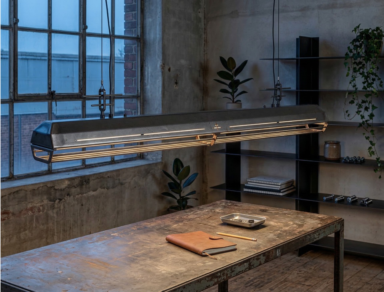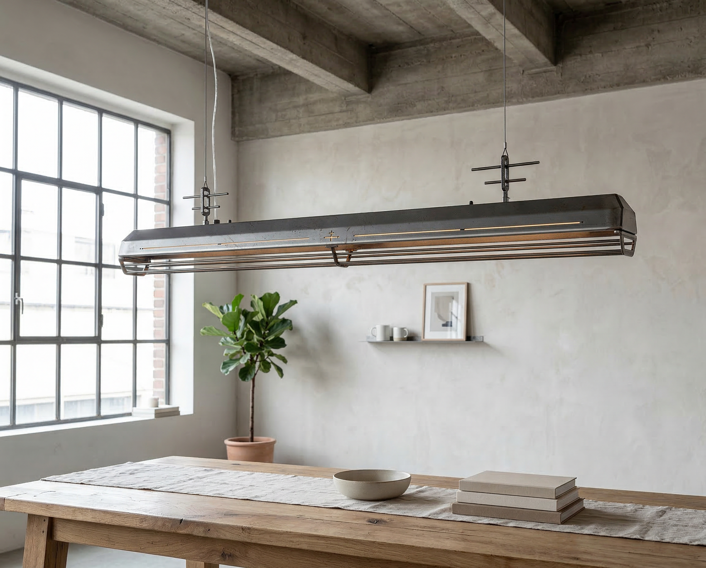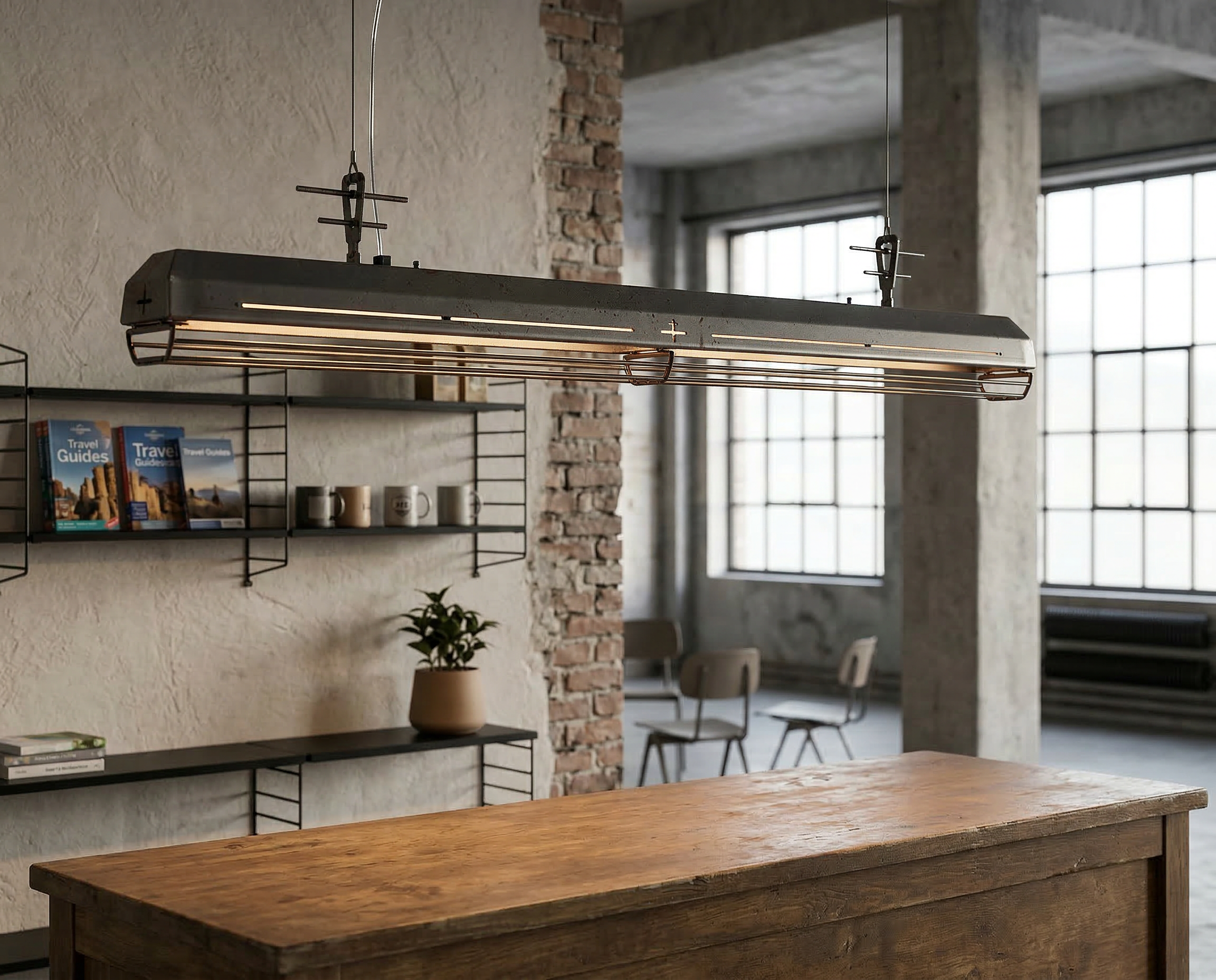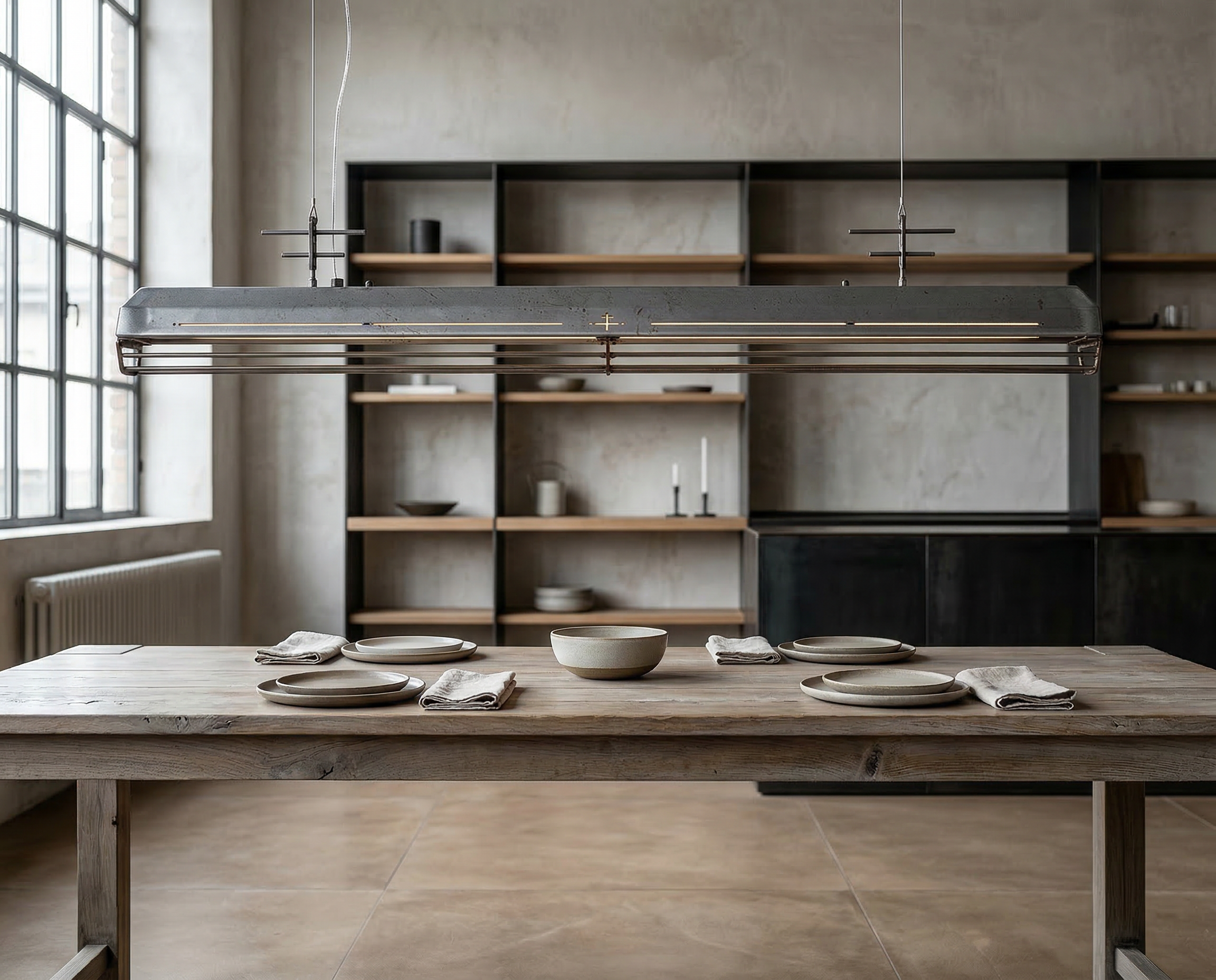 A long industrial presence, defined by its distinctive hangers and the protective grill that runs beneath. In Natural finish, the steel is left exposed—scratches, small flaws, and rust points kept visible, like the surface never forgot the workshop. Precise hardware, lived-in materiality: tactile, honest, and unique in every piece.