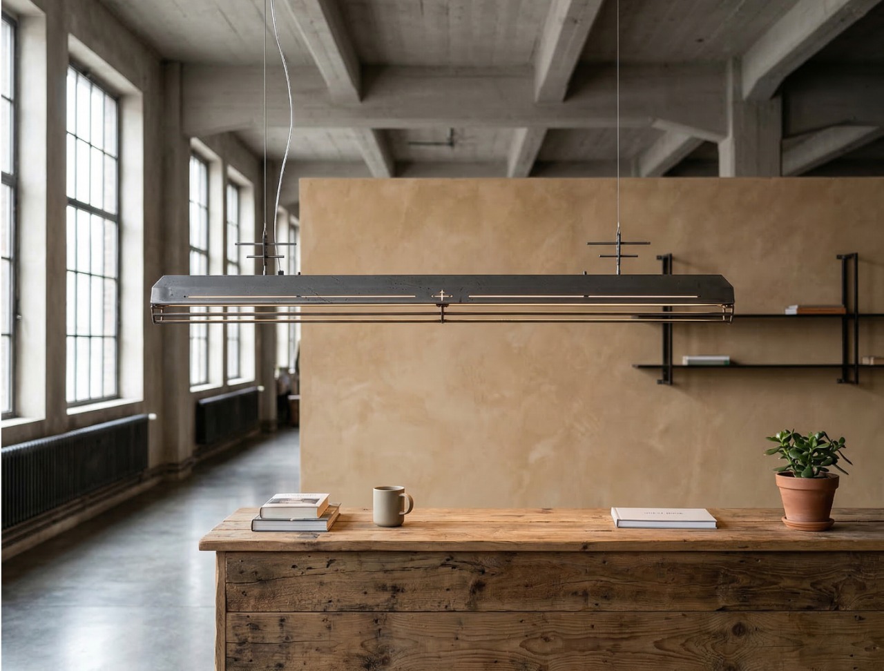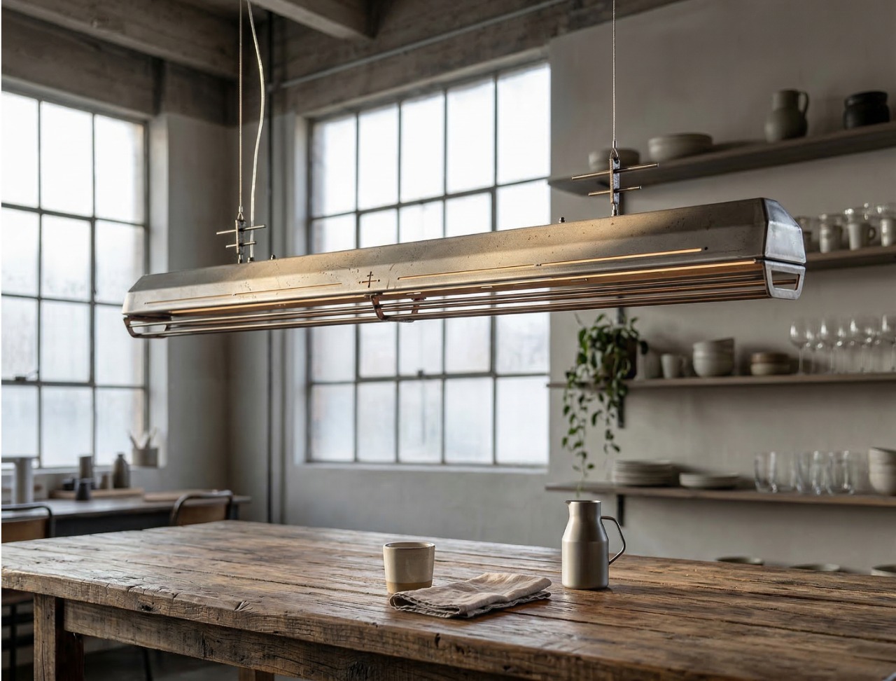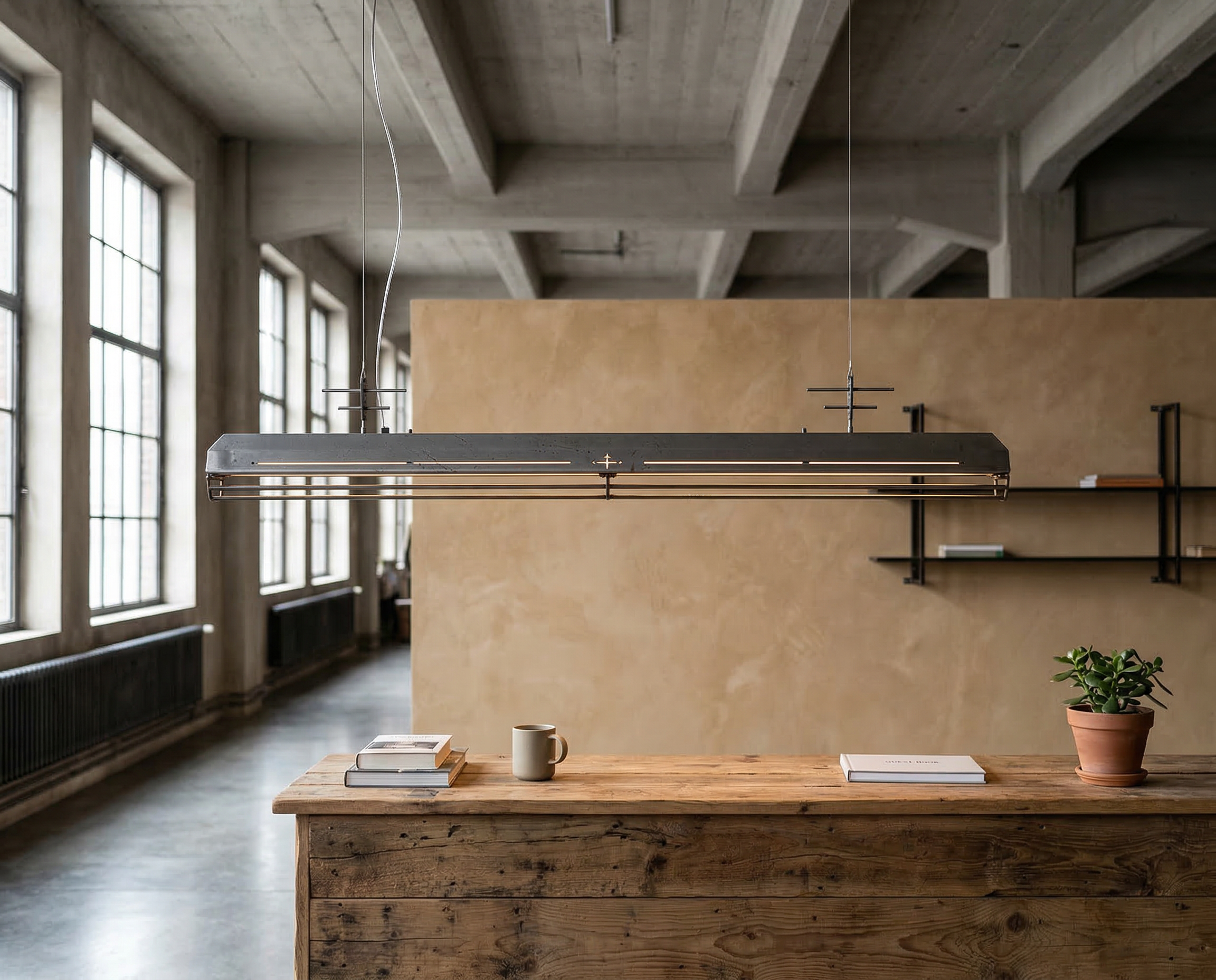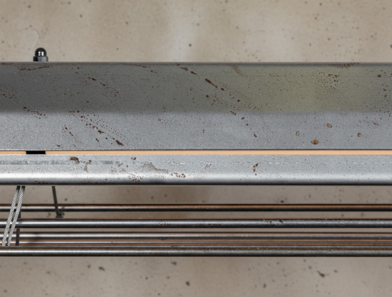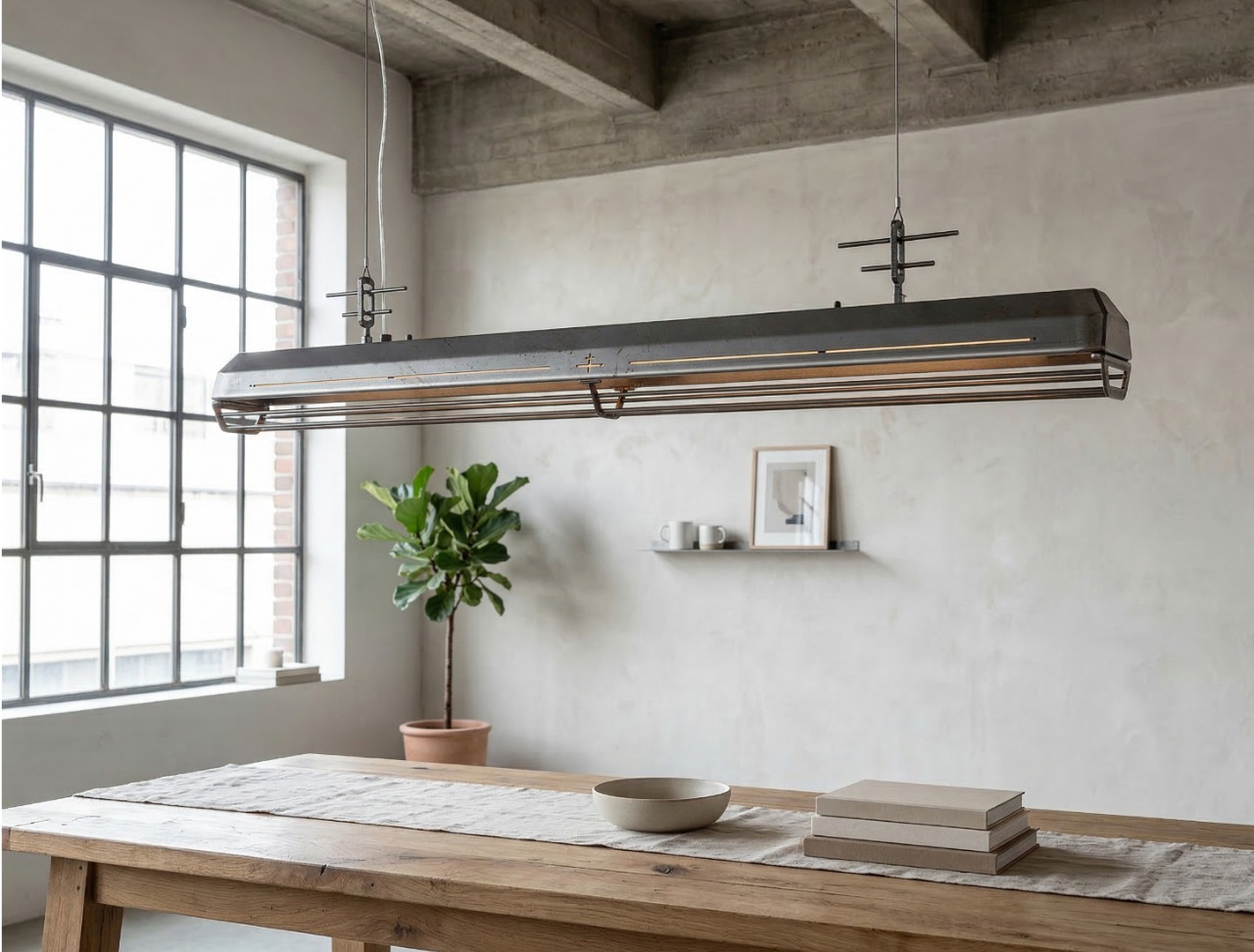 A long industrial presence, defined by its distinctive hangers and the protective grill that runs beneath. In Natural finish, the steel is left exposed—scratches, small flaws, and rust points kept visible, like the surface never forgot the workshop. Precise hardware, lived-in materiality: tactile, honest, and unique in every piece.