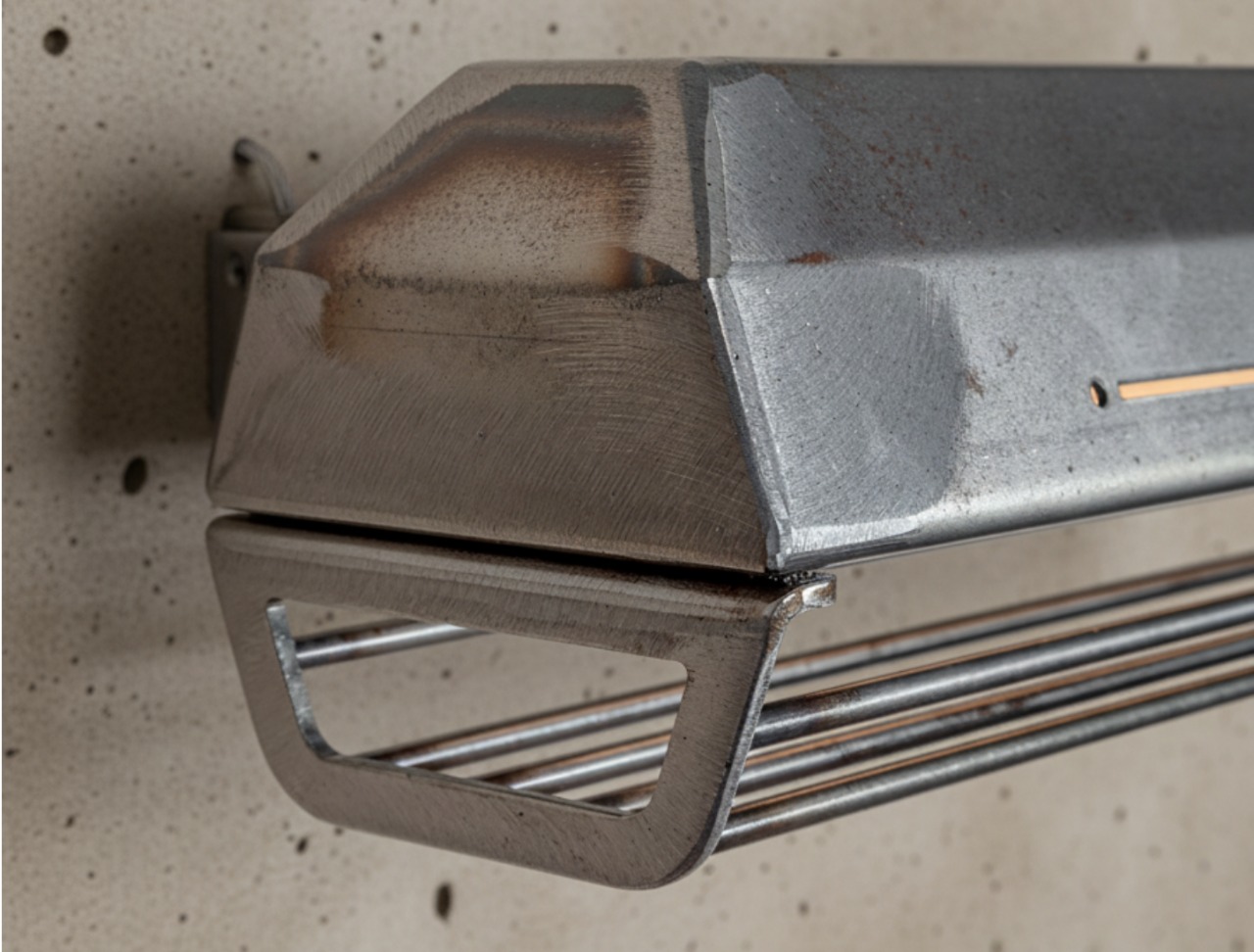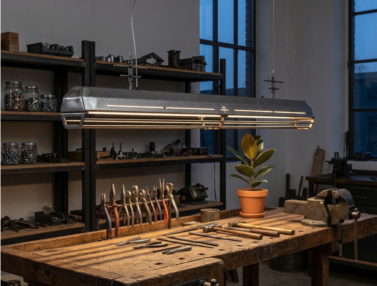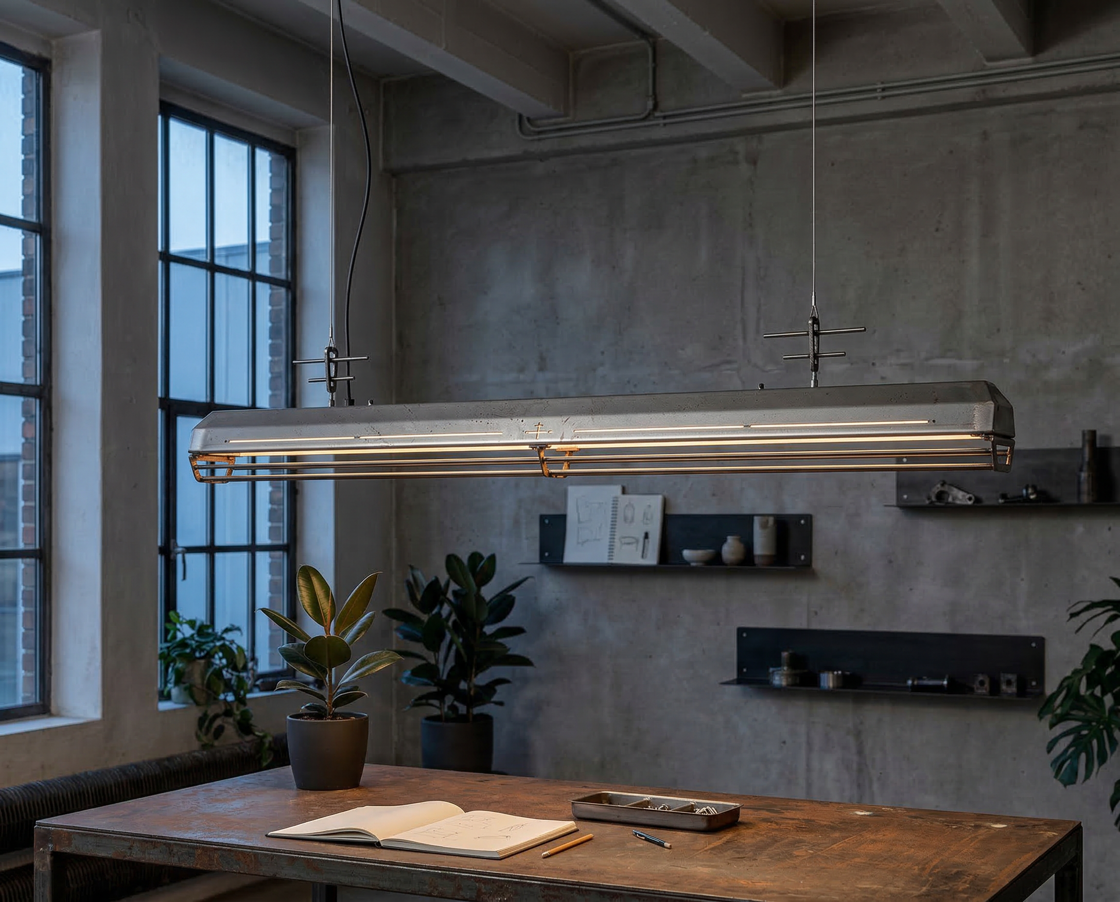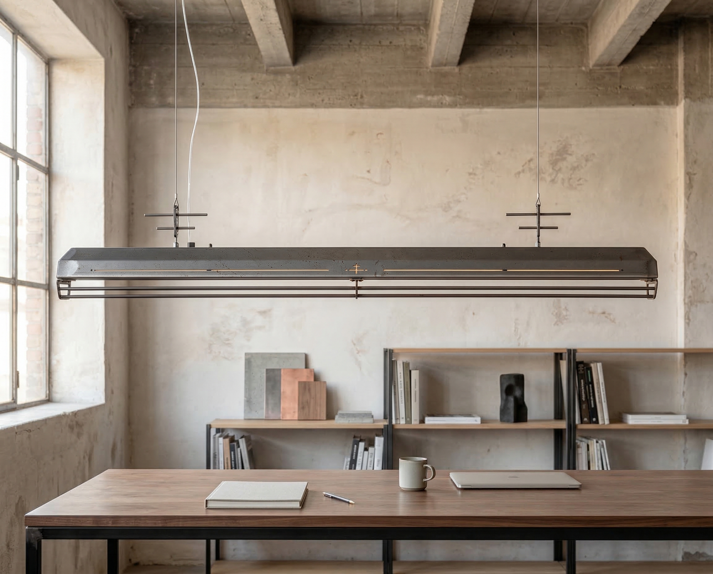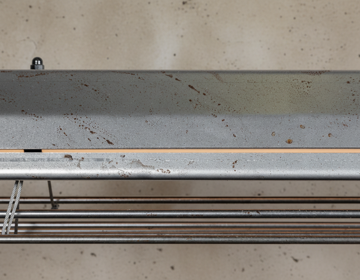 A long industrial presence, defined by its distinctive hangers and the protective grill that runs beneath. In Natural finish, the steel is left exposed—scratches, small flaws, and rust points kept visible, like the surface never forgot the workshop. Precise hardware, lived-in materiality: tactile, honest, and unique in every piece.