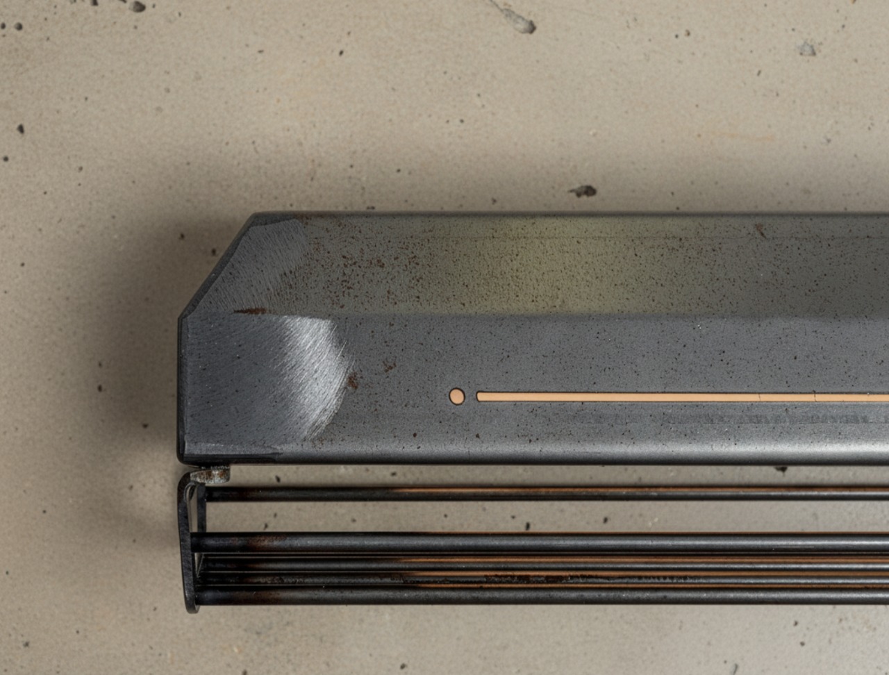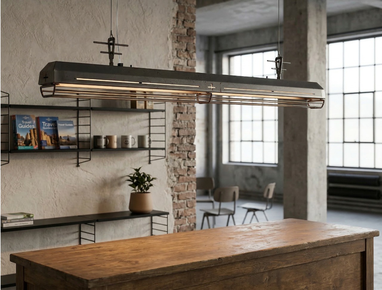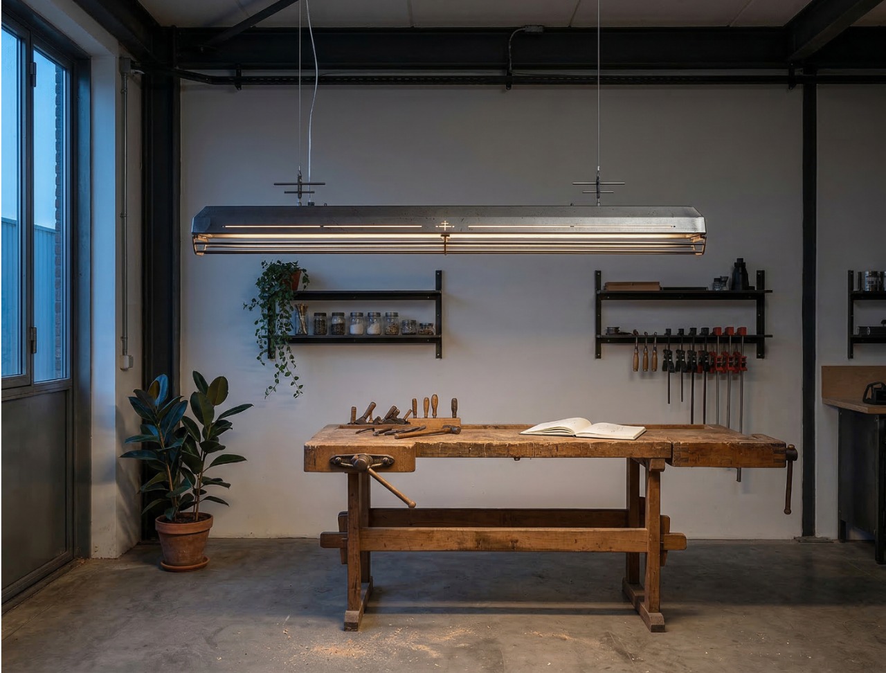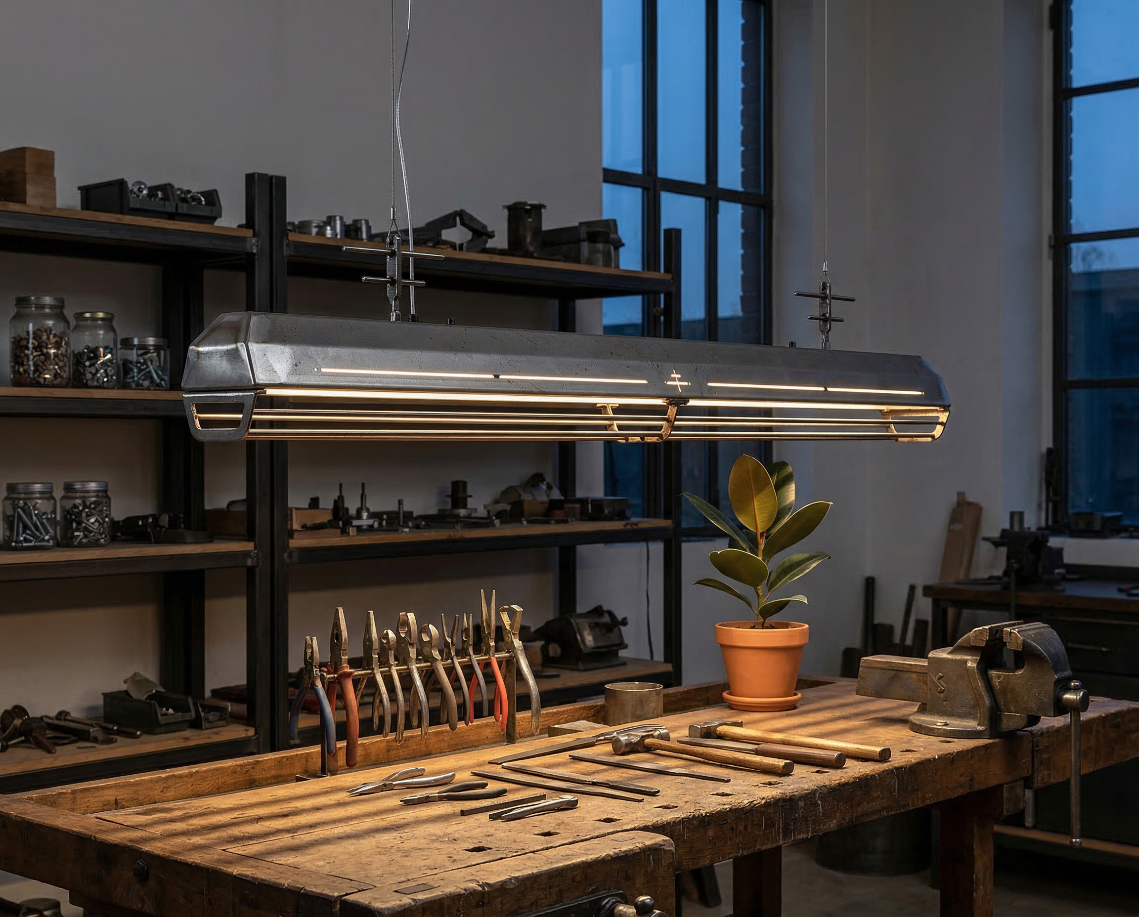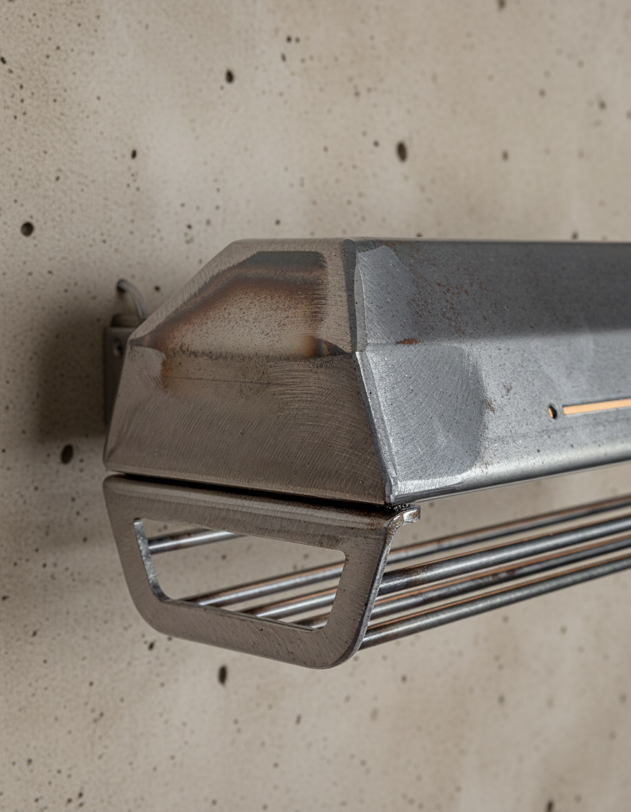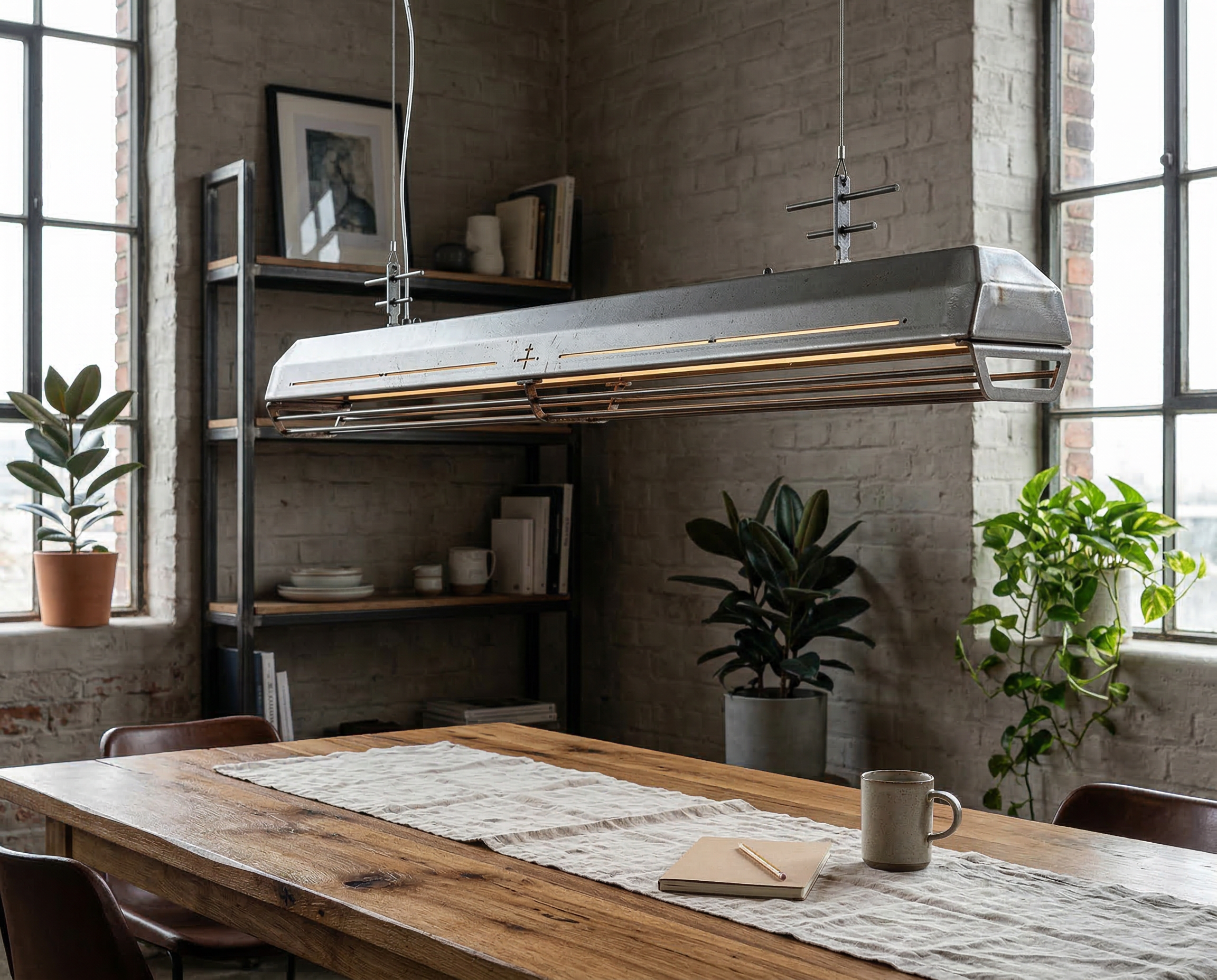 A long industrial presence, defined by its distinctive hangers and the protective grill that runs beneath. In Natural finish, the steel is left exposed—scratches, small flaws, and rust points kept visible, like the surface never forgot the workshop. Precise hardware, lived-in materiality: tactile, honest, and unique in every piece.