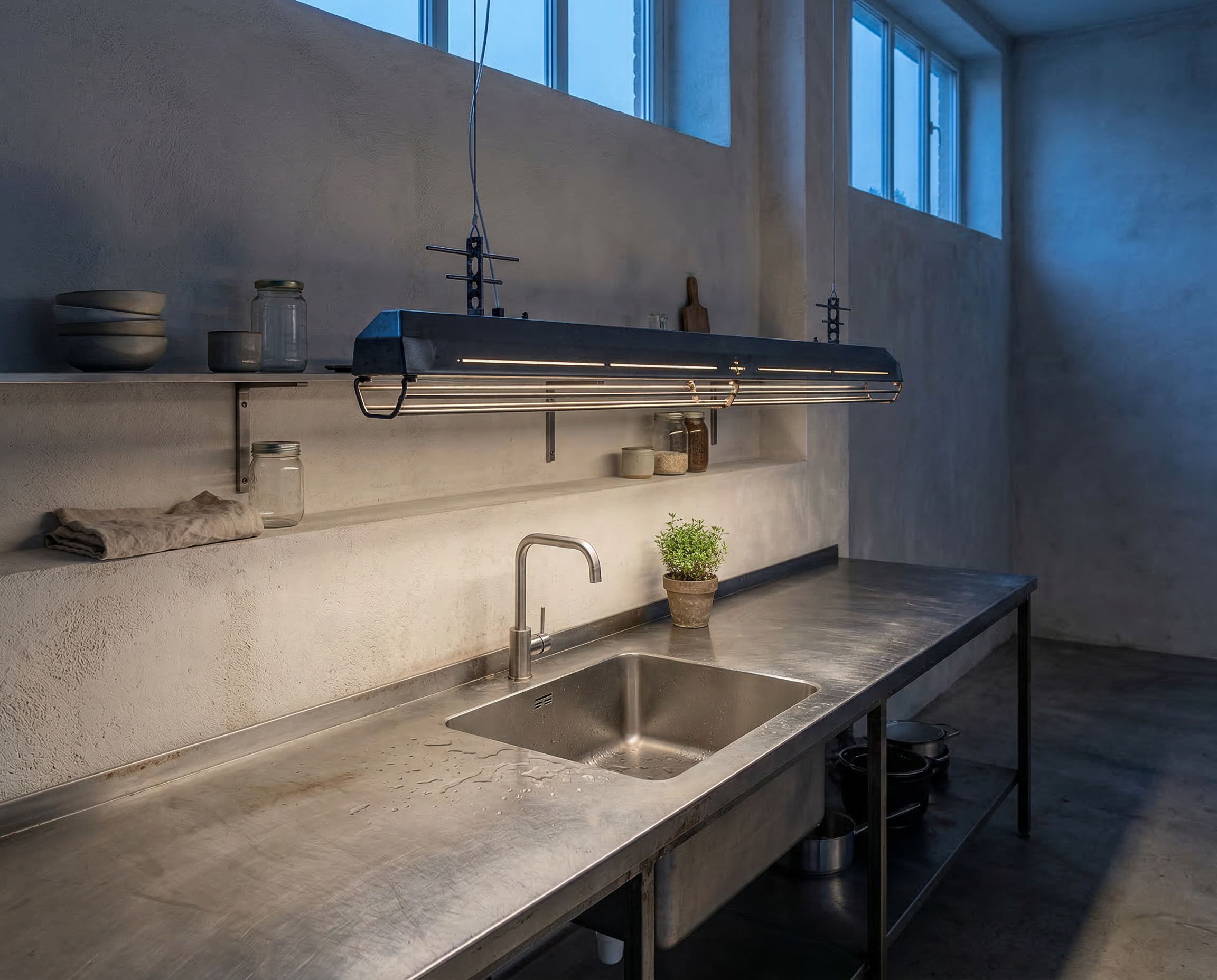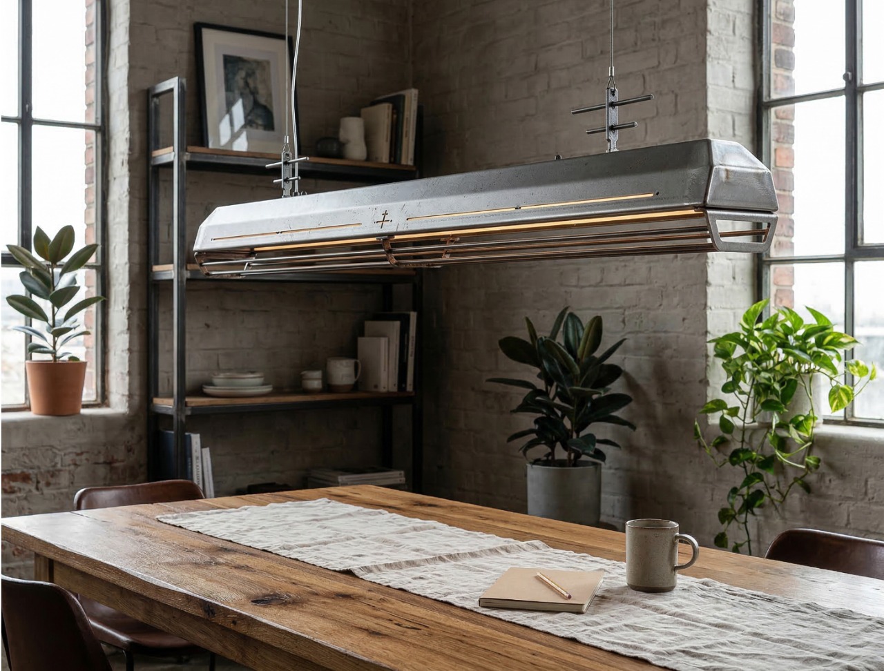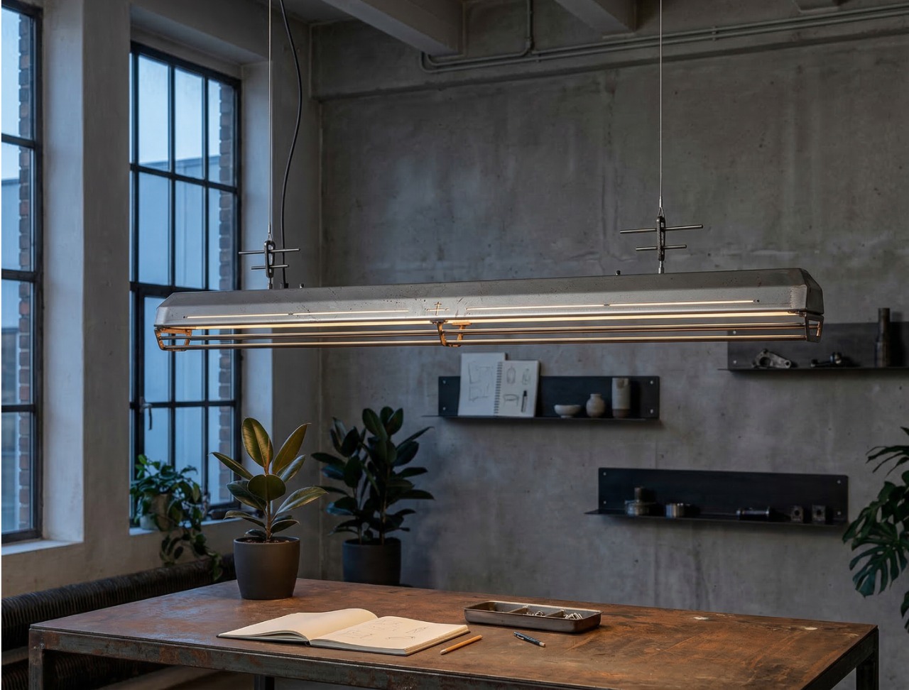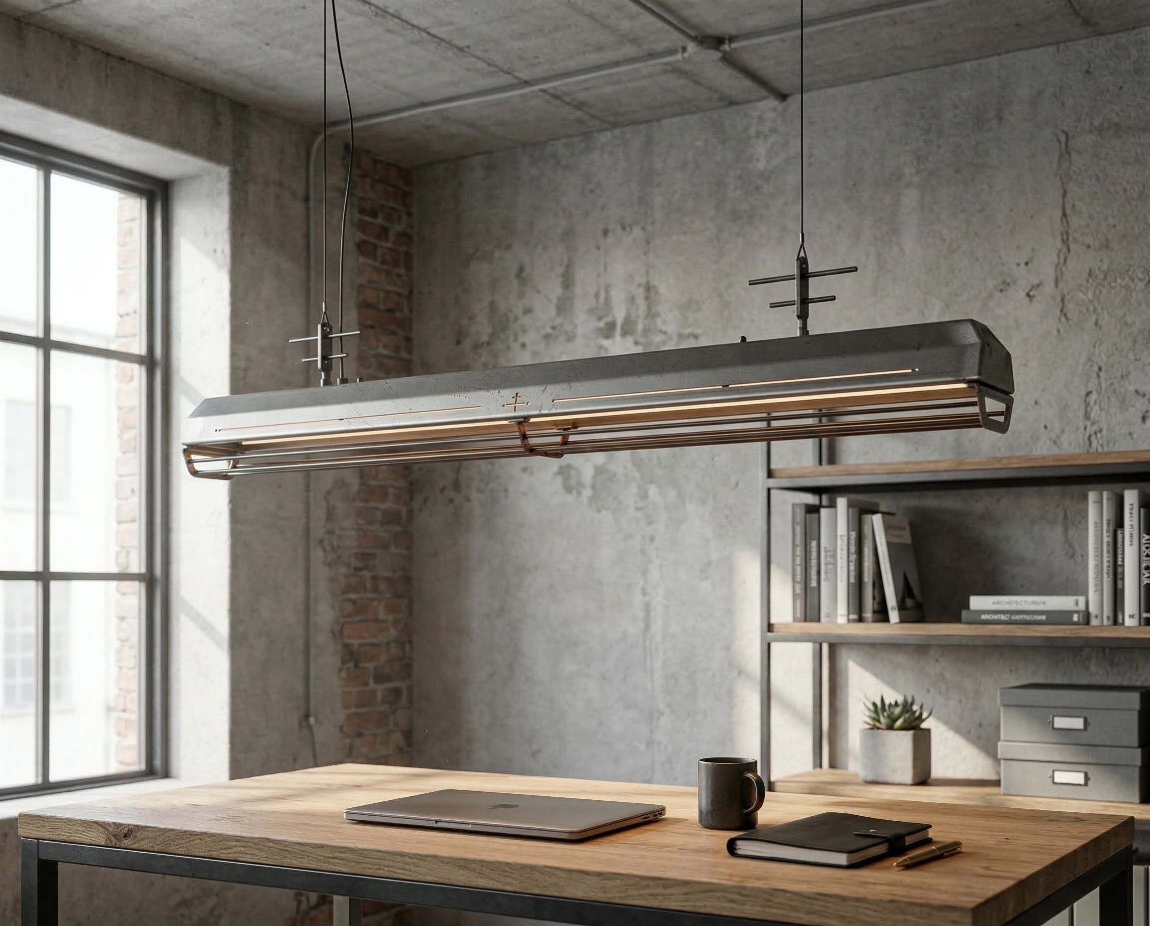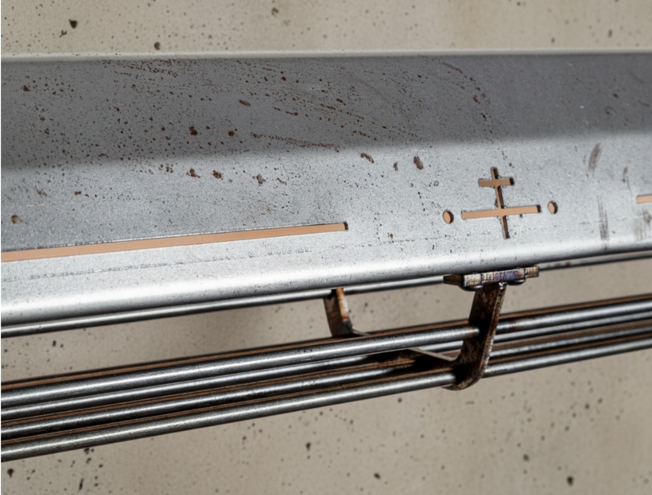 A long industrial presence, defined by its distinctive hangers and the protective grill that runs beneath. In Natural finish, the steel is left exposed—scratches, small flaws, and rust points kept visible, like the surface never forgot the workshop. Precise hardware, lived-in materiality: tactile, honest, and unique in every piece.
