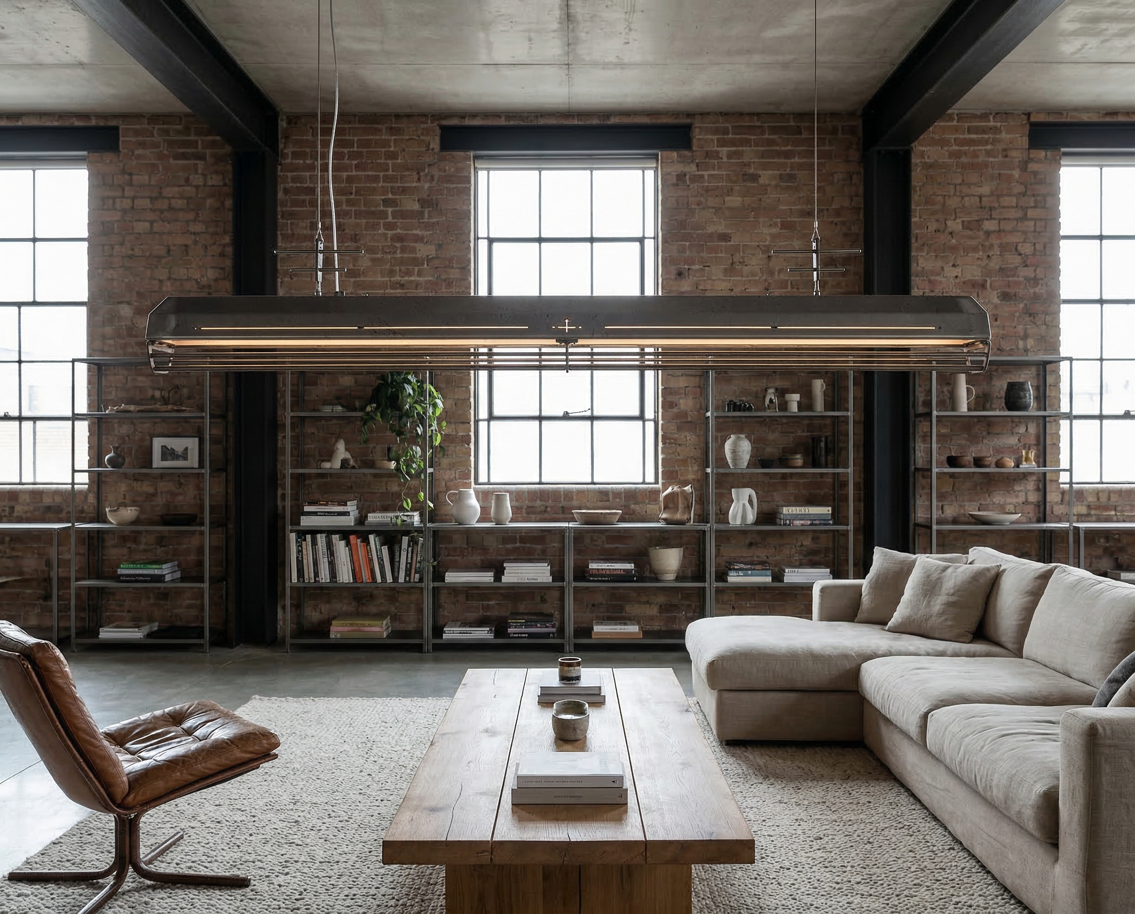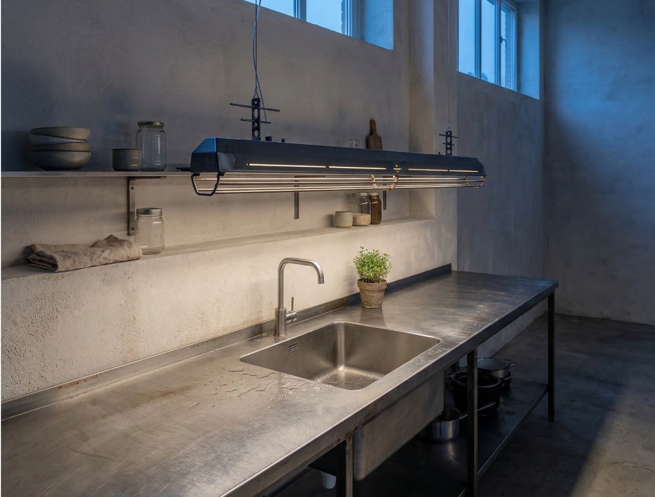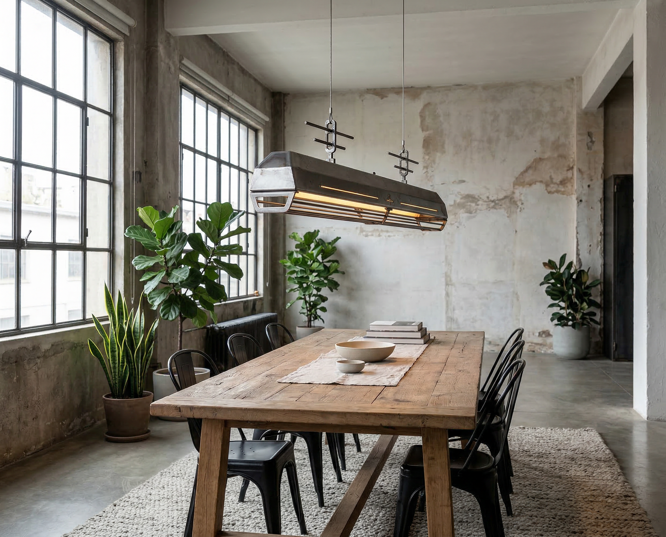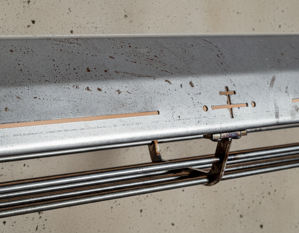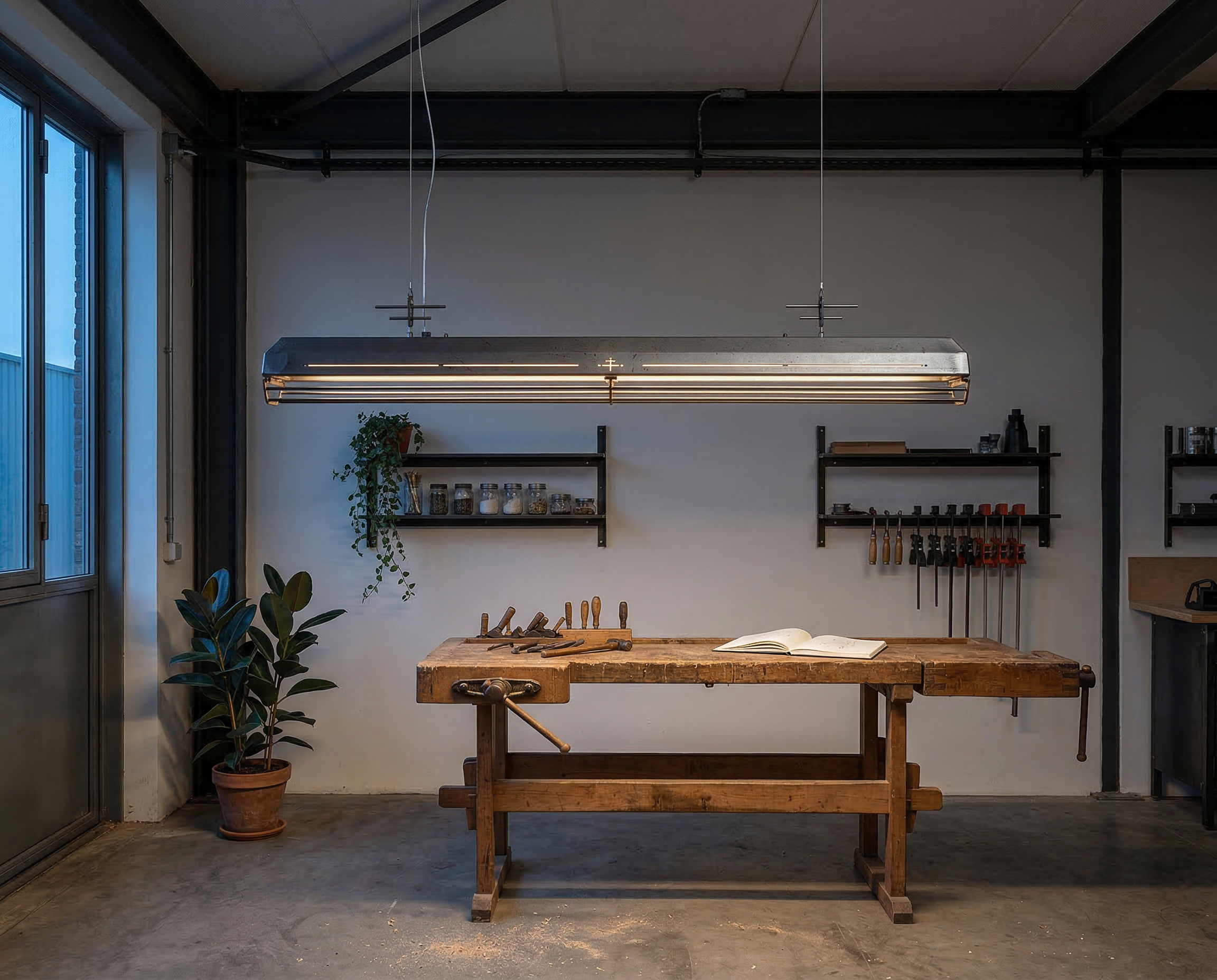 A long industrial presence, defined by its distinctive hangers and the protective grill that runs beneath. In Natural finish, the steel is left exposed—scratches, small flaws, and rust points kept visible, like the surface never forgot the workshop. Precise hardware, lived-in materiality: tactile, honest, and unique in every piece.
