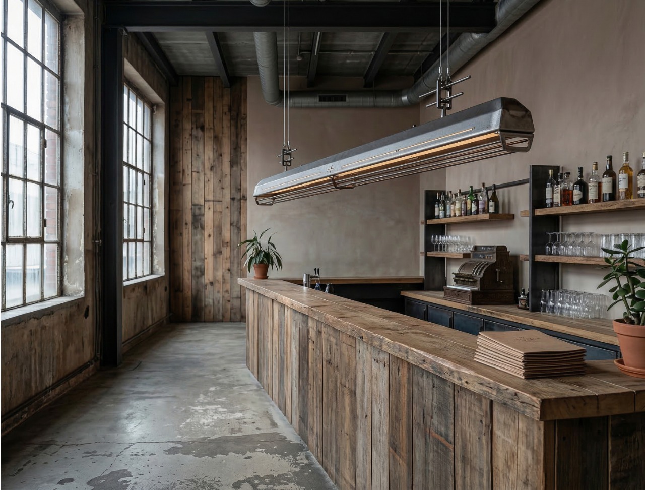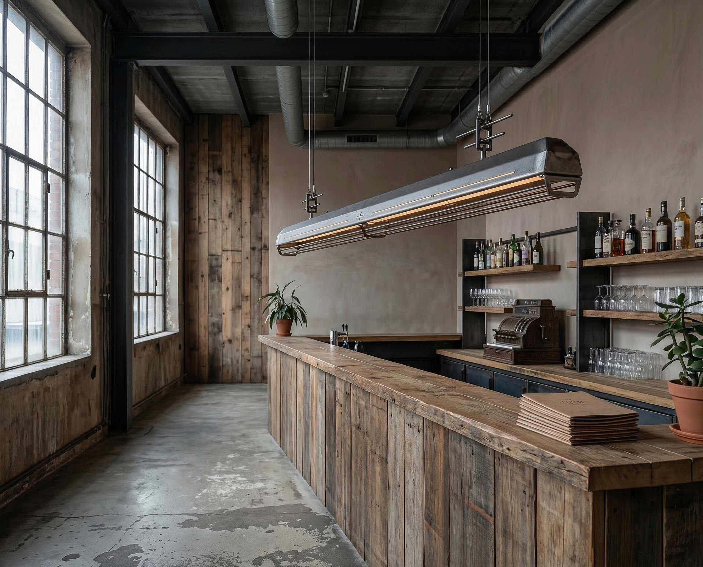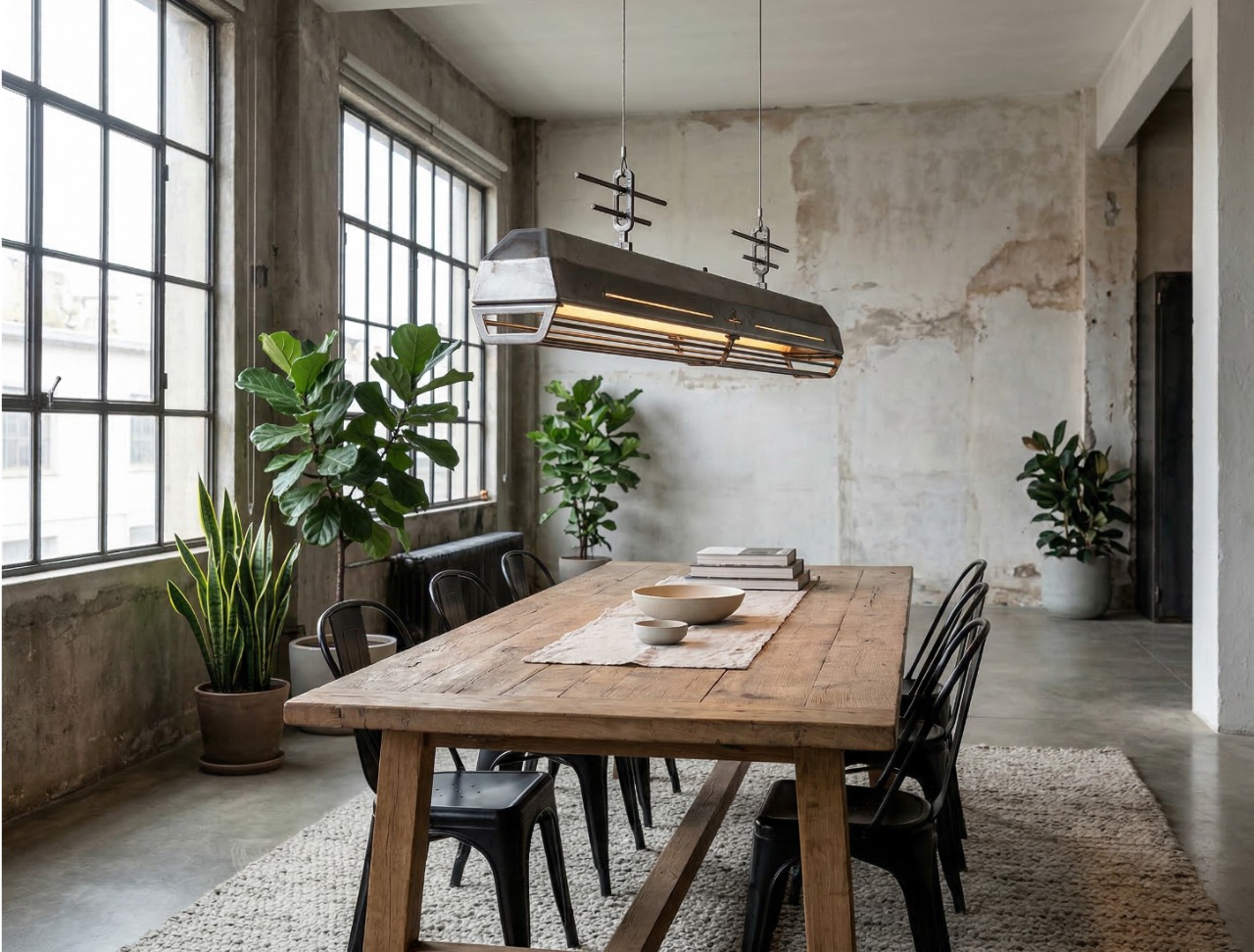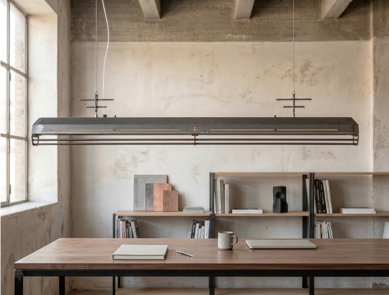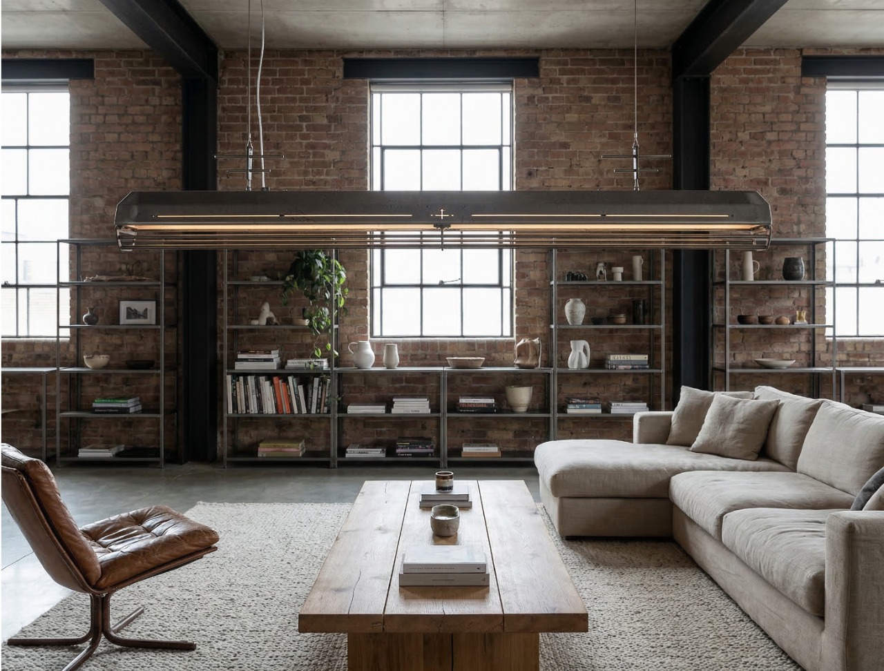 A long industrial presence, defined by its distinctive hangers and the protective grill that runs beneath. In Natural finish, the steel is left exposed—scratches, small flaws, and rust points kept visible, like the surface never forgot the workshop. Precise hardware, lived-in materiality: tactile, honest, and unique in every piece.