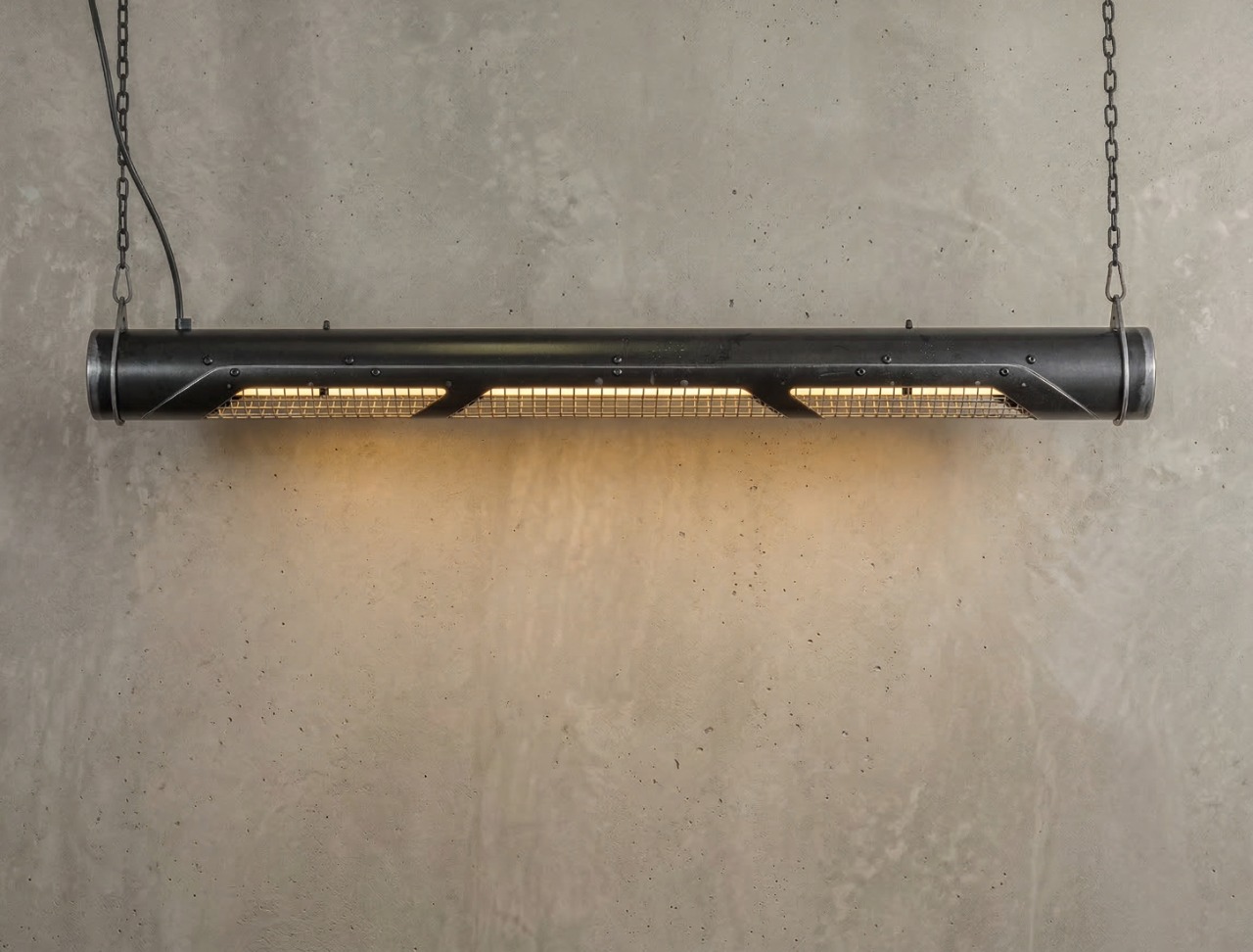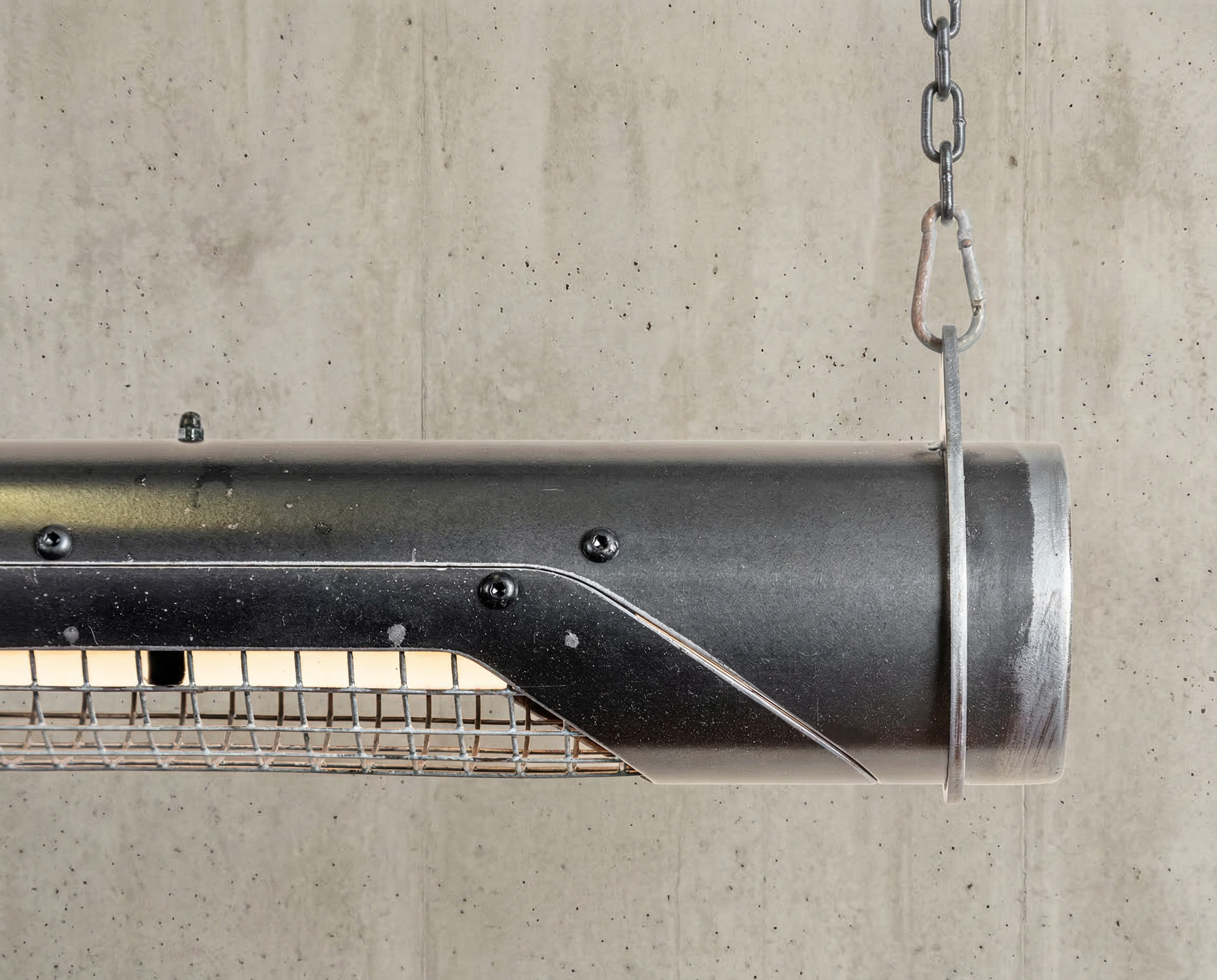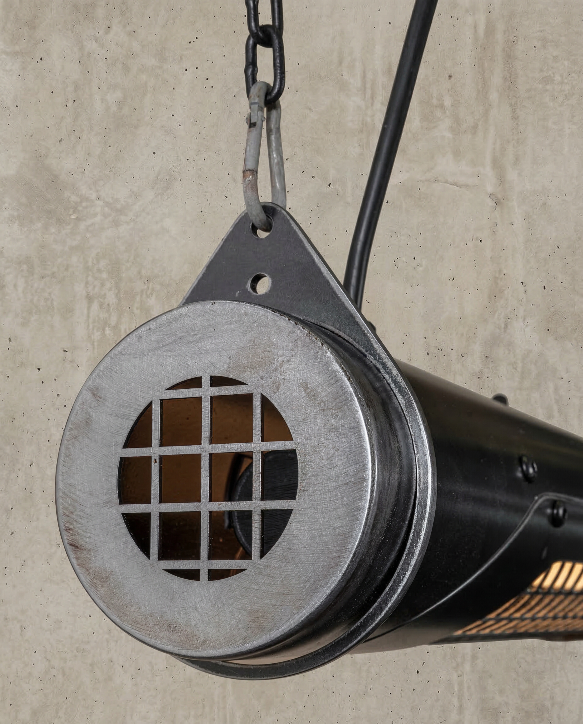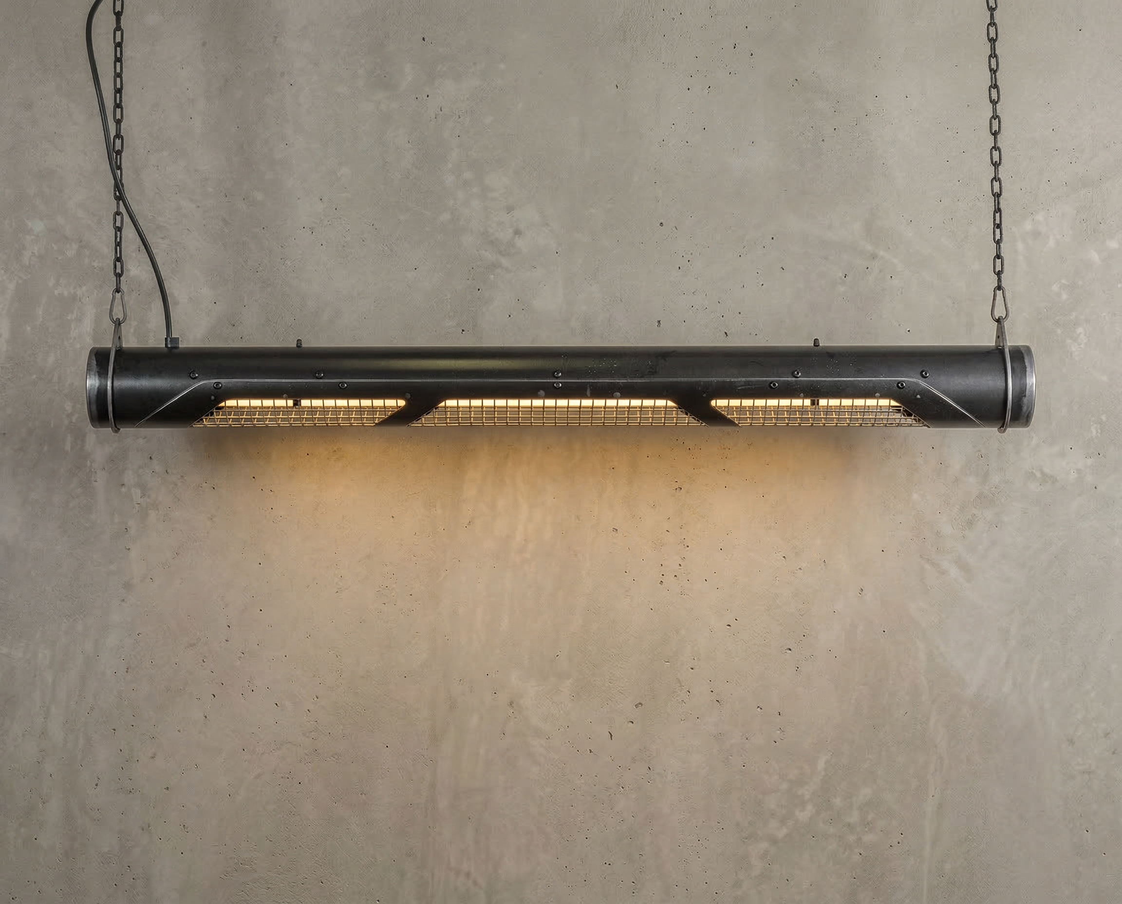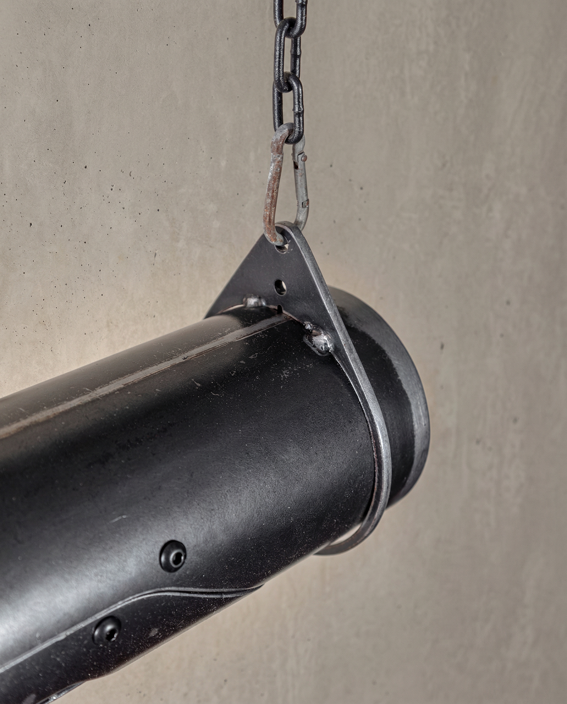 Metro feels like a piece of infrastructure made intimate: a long, calm cylinder, framed by cutout windows and a woven iron grill. The end caps close it like a sealed artifact, while the hangers read as honest hardware—simple, tough, and quietly specific. In Natural finish, the surface stays unedited: scratches, stains, and rubbed edges become the texture of time, turning the object into something you don’t just see—you feel.