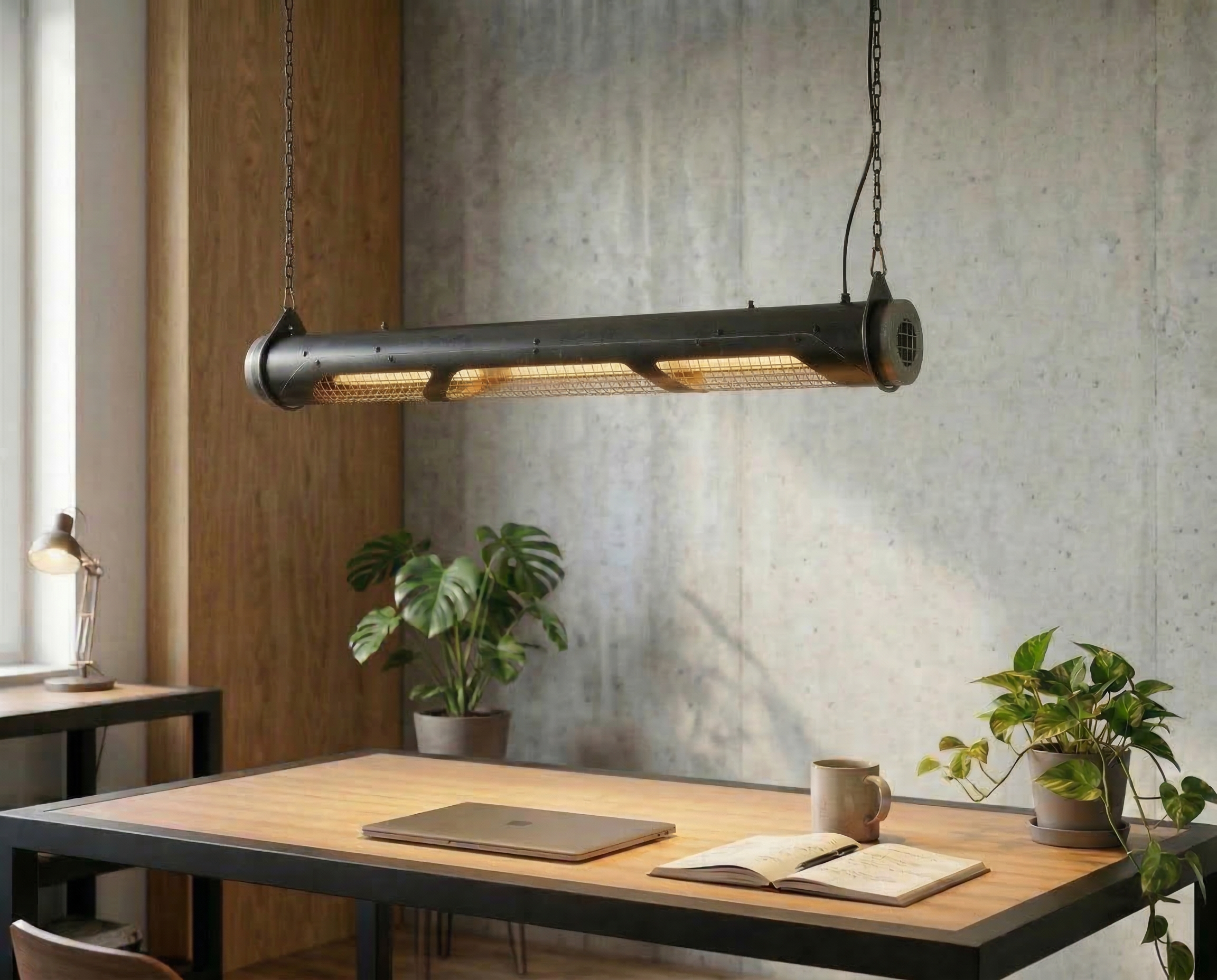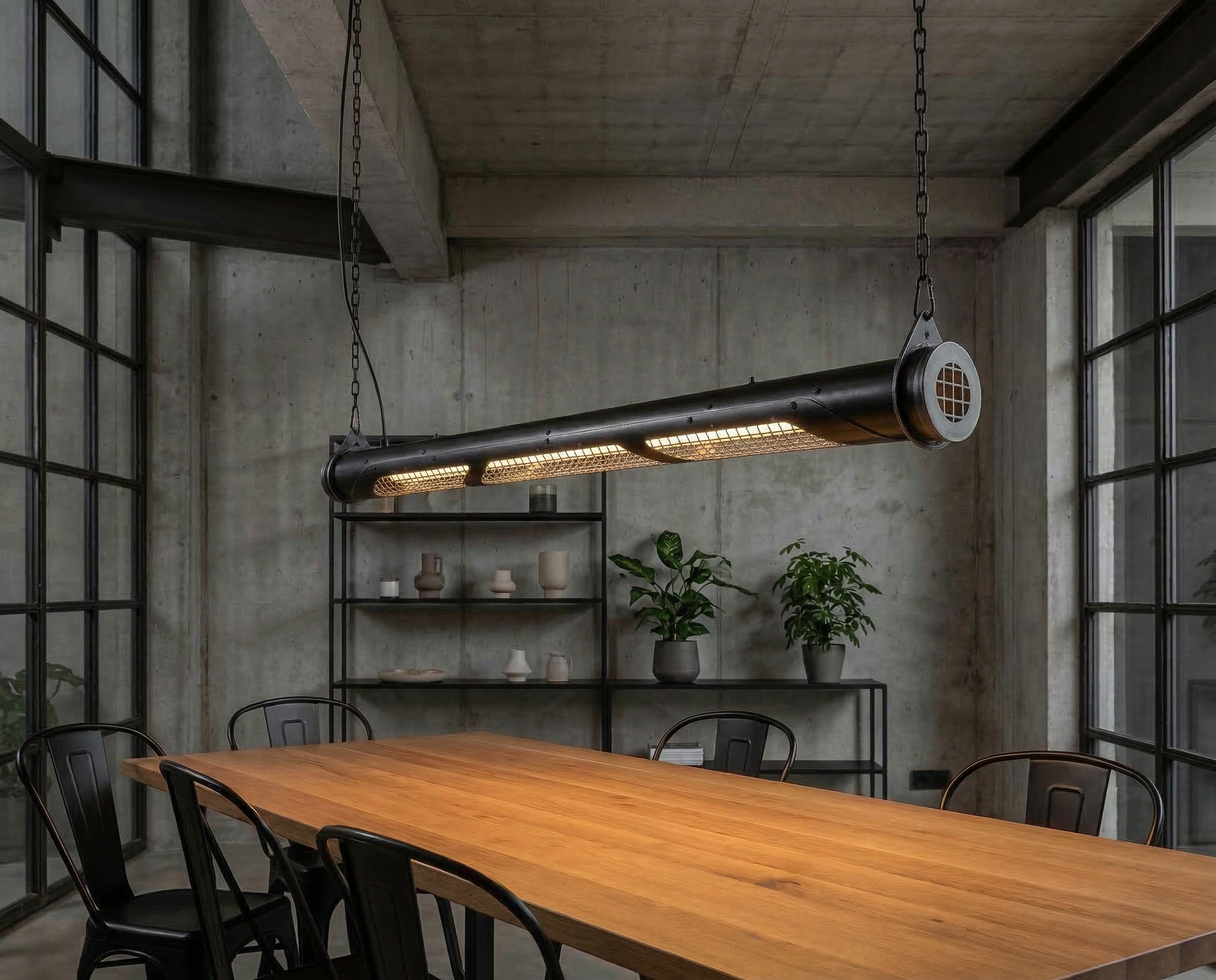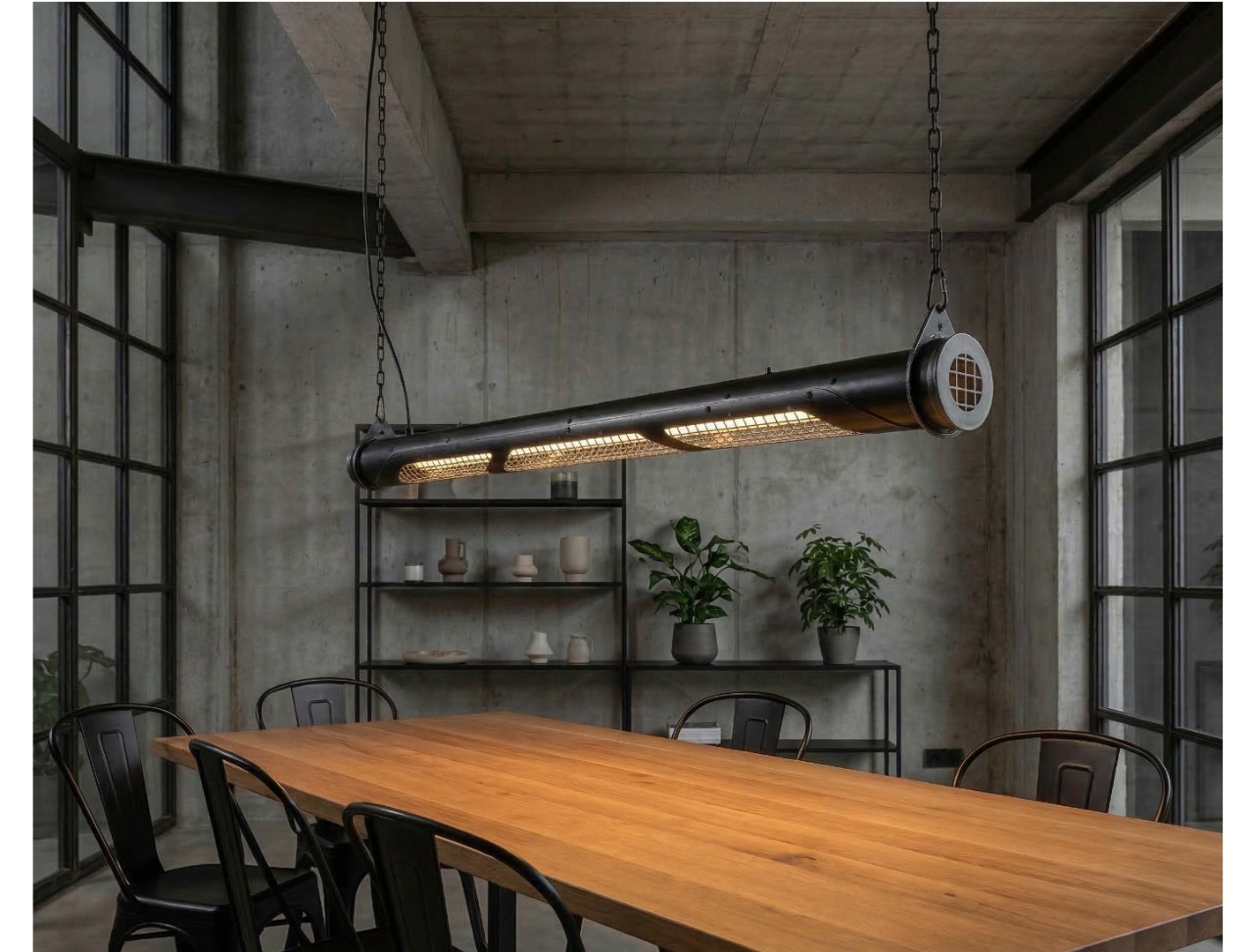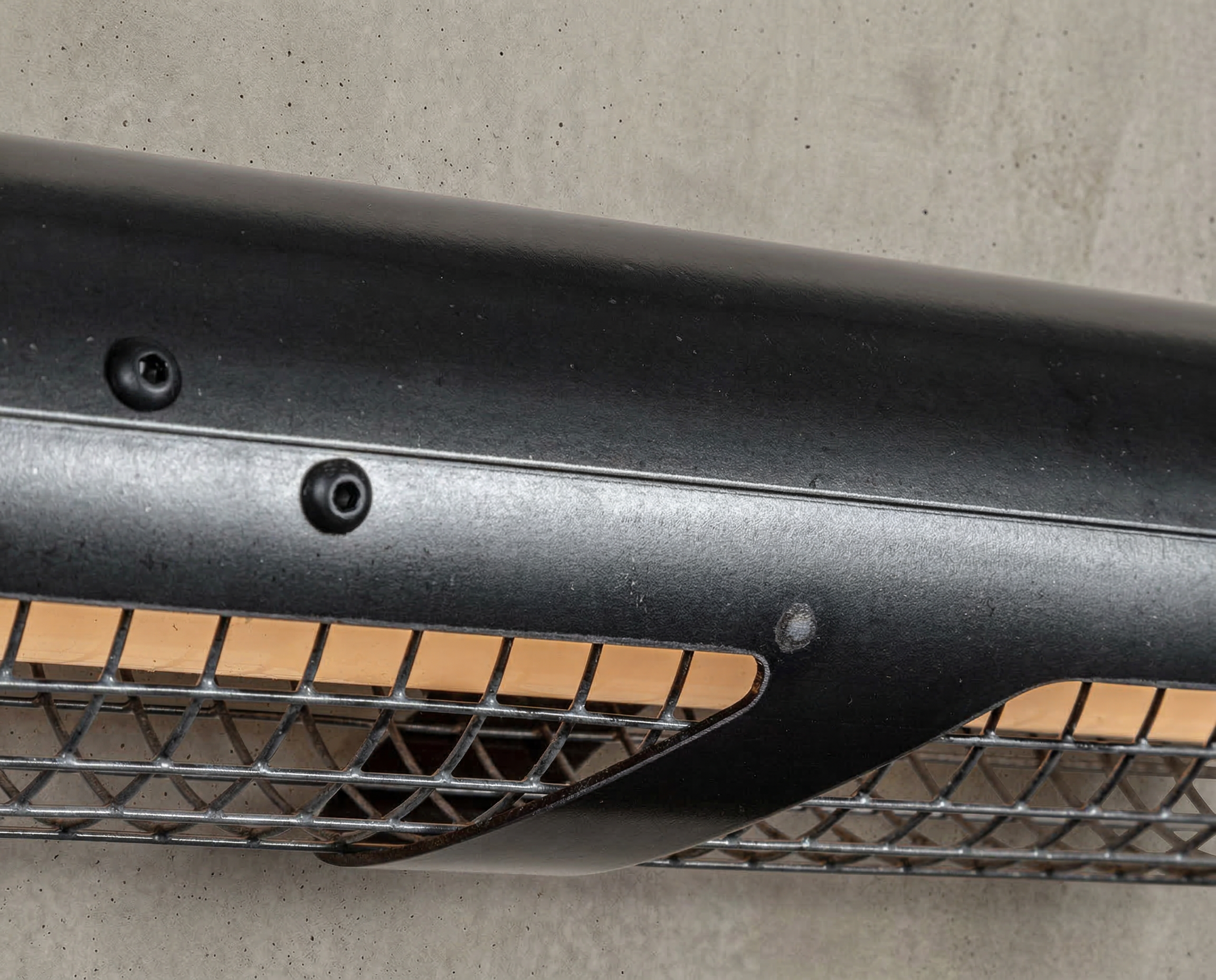 Metro feels like a piece of infrastructure made intimate: a long, calm cylinder, framed by cutout windows and a woven iron grill. The end caps close it like a sealed artifact, while the hangers read as honest hardware—simple, tough, and quietly specific. In Natural finish, the surface stays unedited: scratches, stains, and rubbed edges become the texture of time, turning the object into something you don’t just see—you feel.