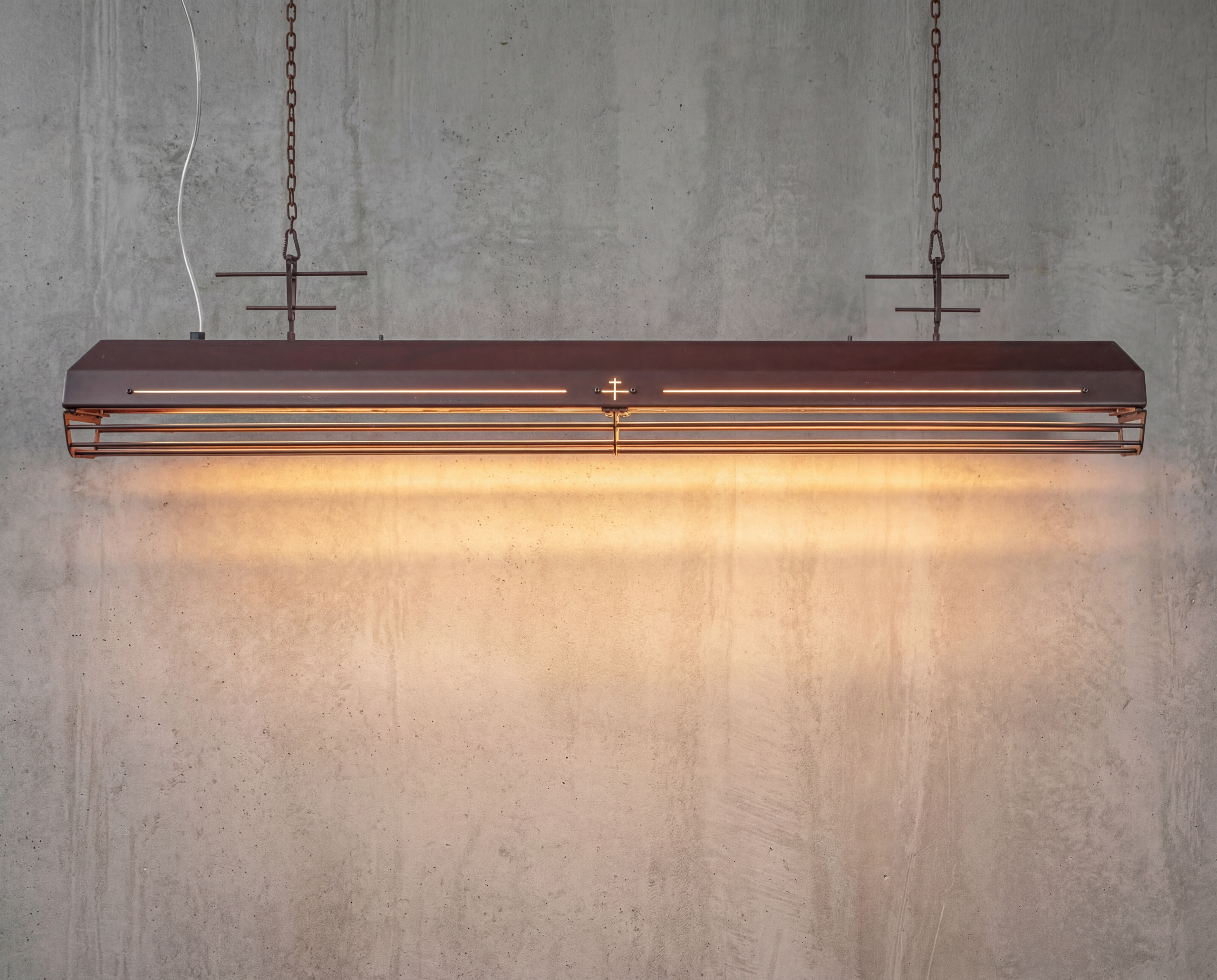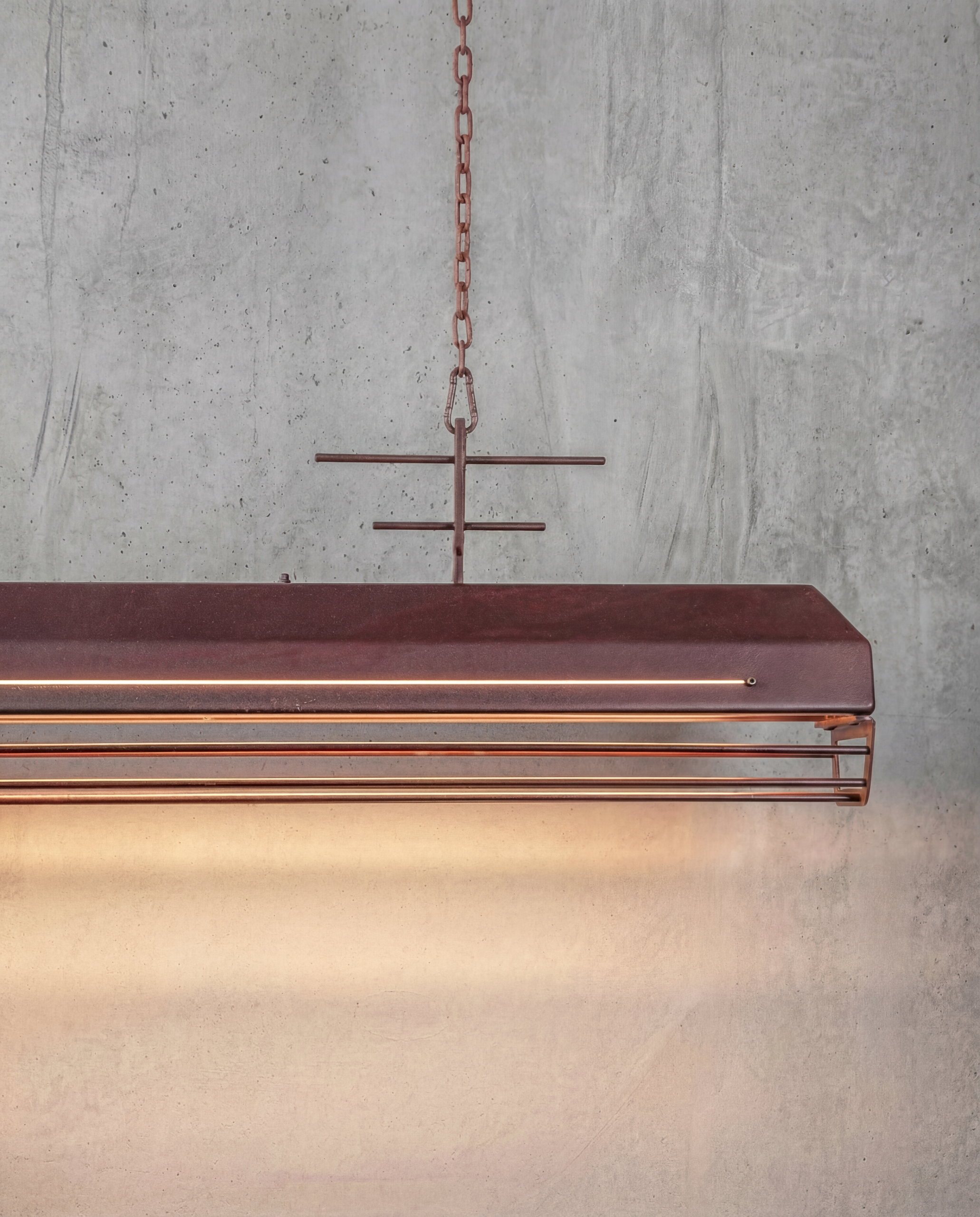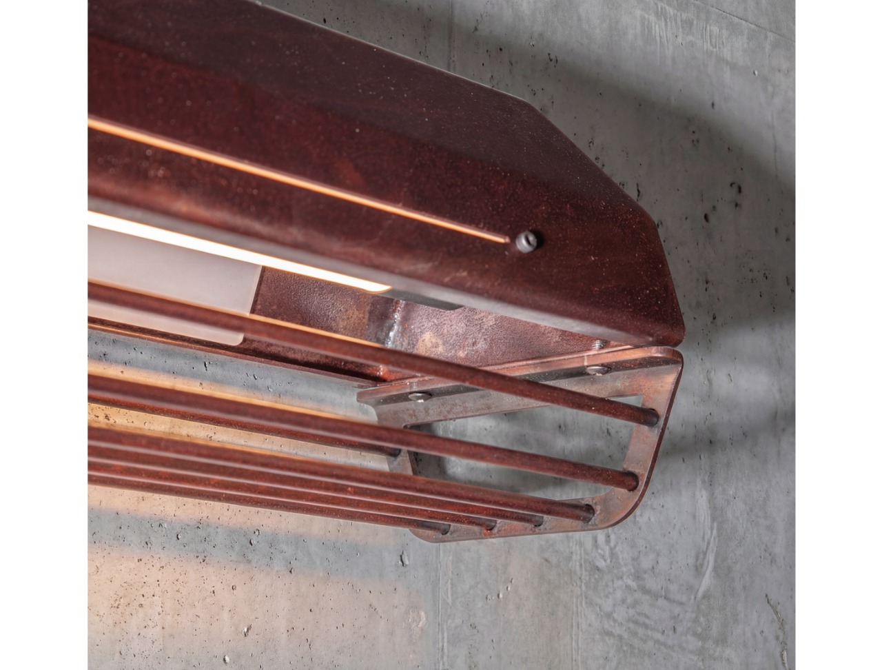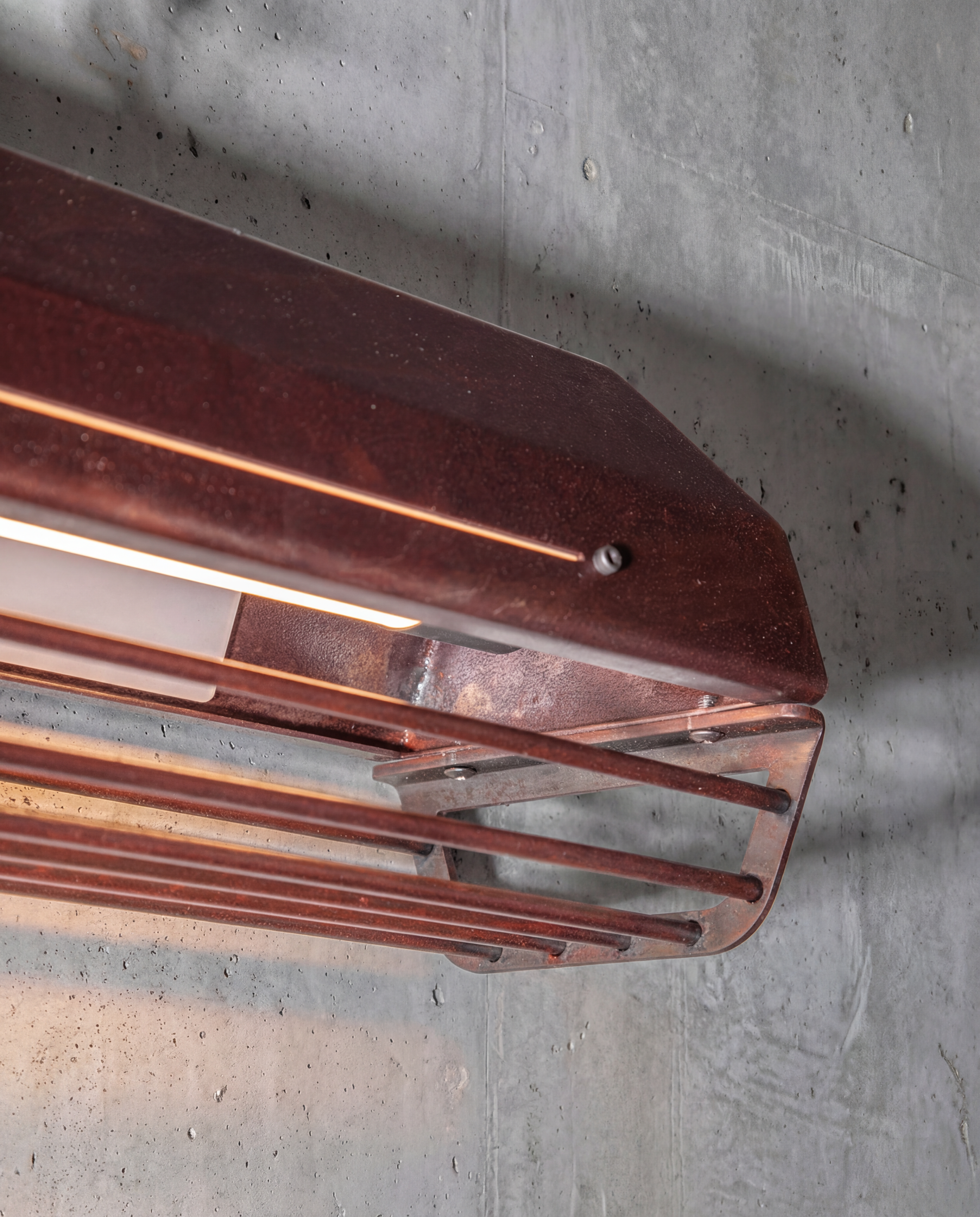 A nostalgic industrial form, held by its own distinctive hangers—like hardware turned into jewelry. Wild rust settles into the steel in smoky gradients and drifting stains, letting time become part of the surface. A fine crack runs through the composition like a deliberate seam, a quiet interruption that makes the geometry breathe. Below, the grill repeats in a steady rhythm—shadow, texture, and a tactile sense of weight. Each piece carries a singular trace of process and oxidation: rough, warm, and alive.