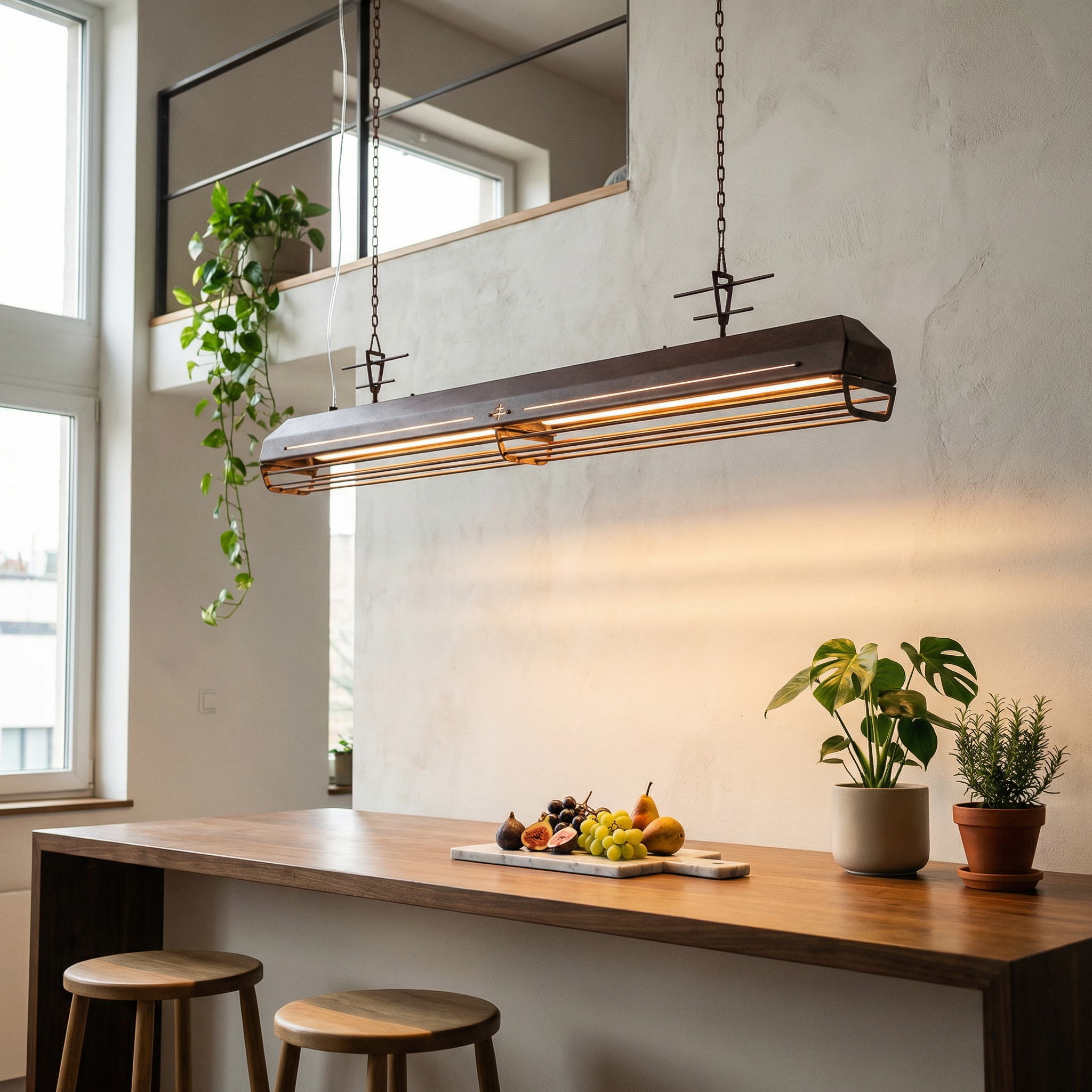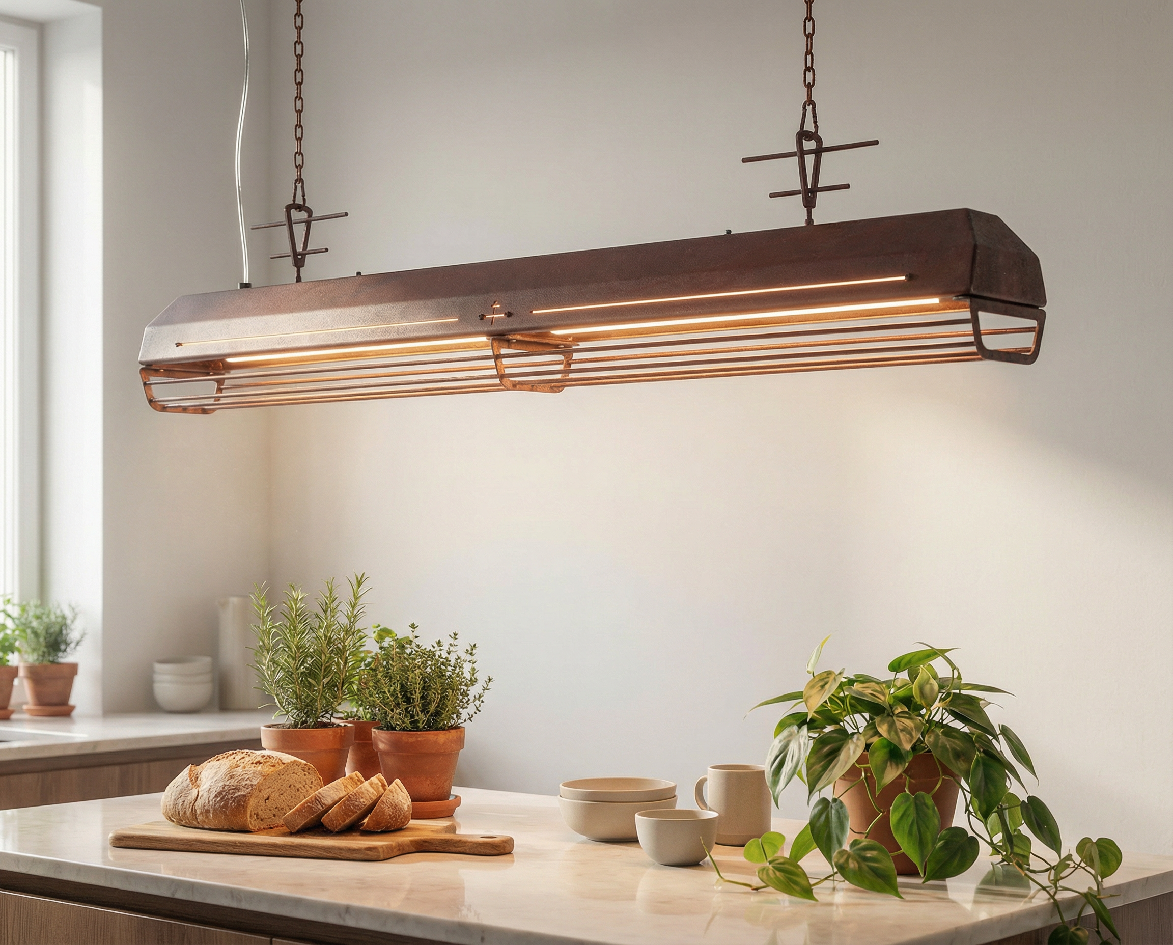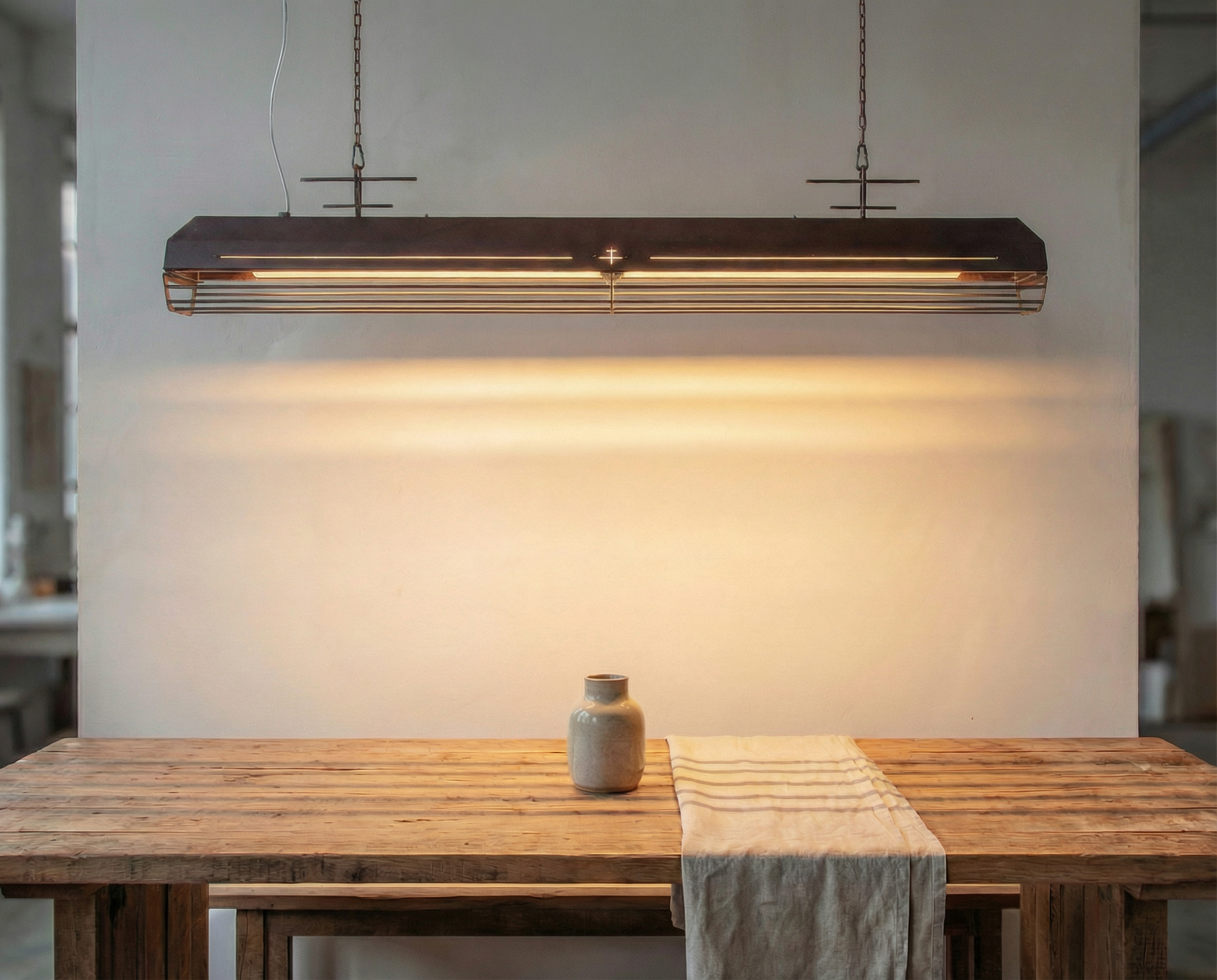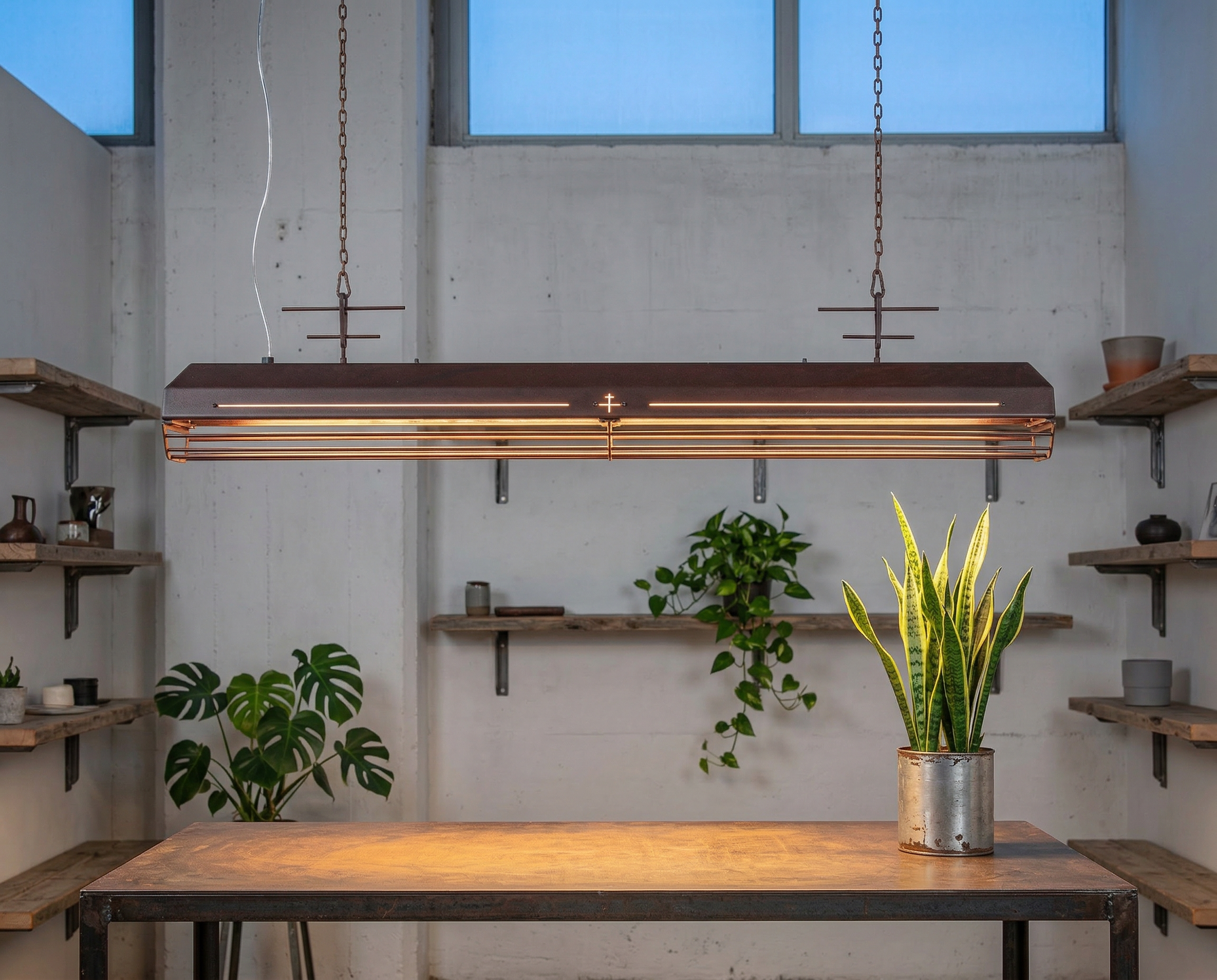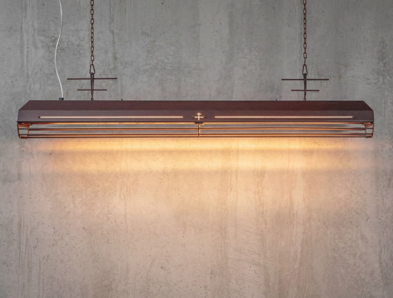 A nostalgic industrial form, held by its own distinctive hangers—like hardware turned into jewelry. Wild rust settles into the steel in smoky gradients and drifting stains, letting time become part of the surface. A fine crack runs through the composition like a deliberate seam, a quiet interruption that makes the geometry breathe. Below, the grill repeats in a steady rhythm—shadow, texture, and a tactile sense of weight. Each piece carries a singular trace of process and oxidation: rough, warm, and alive.