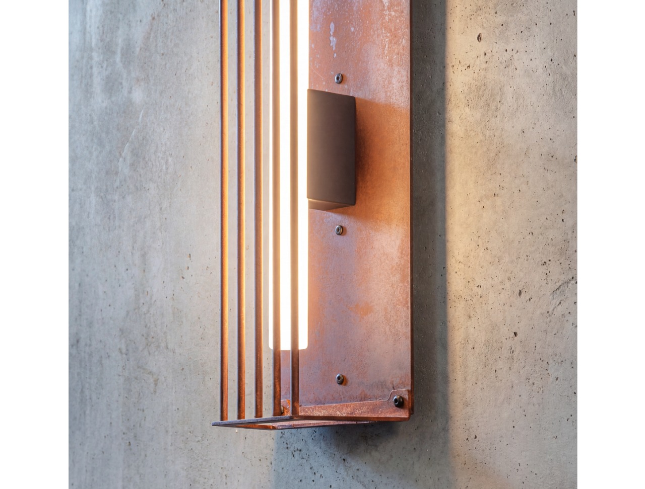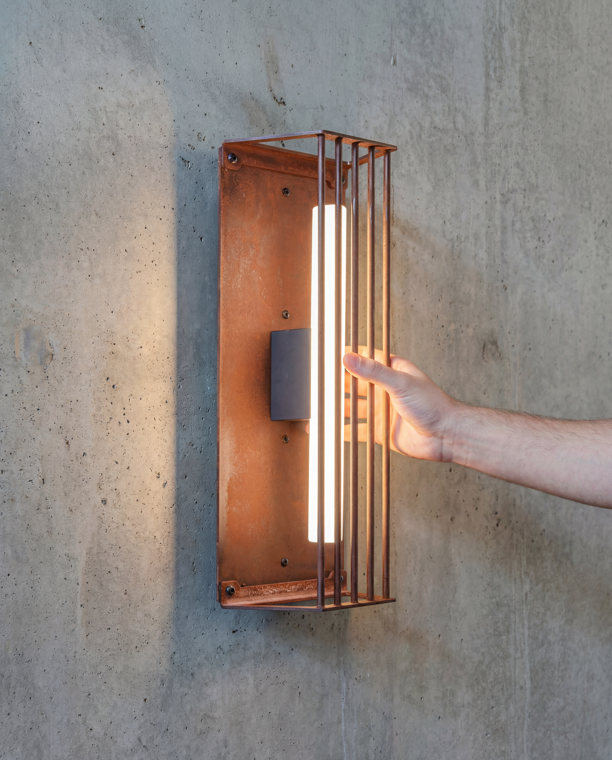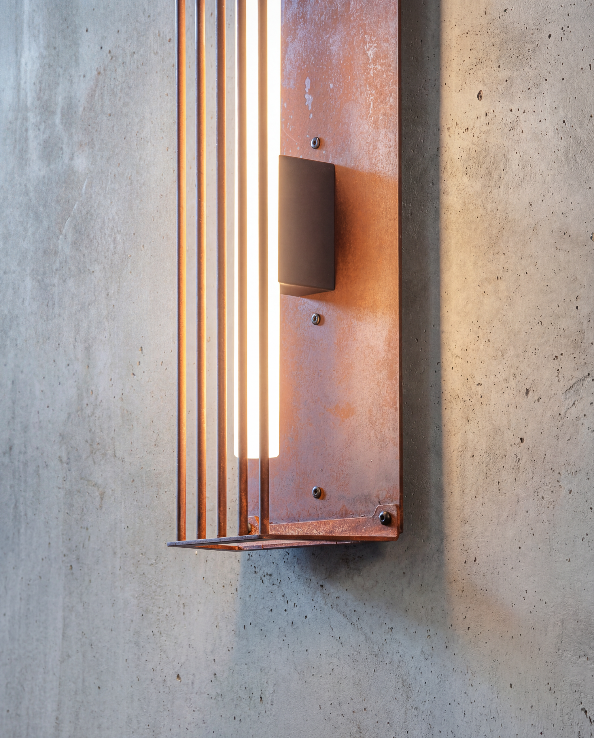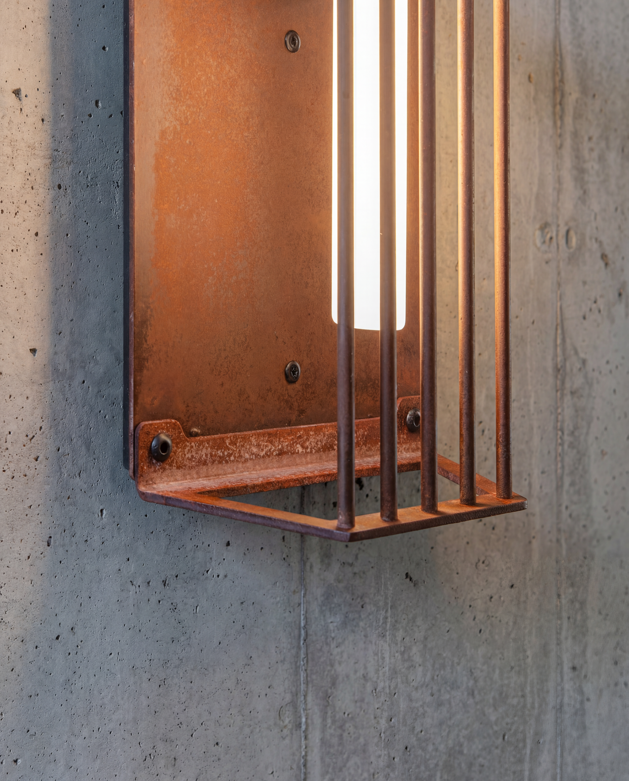 Wild rust drifts across it like weather: warm, irregular, intimate. It gathers in stains and shadows, softening the geometry without ever blurring it. No two surfaces repeat; each one carries its own time, its own touch, its own delicate scars.
